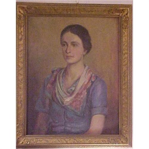 Here is a wonderful 1920's oil on canvas portrait of a serene young woman in a blue dress and scarf, encased in a giltwood frame, signed "Pricilla Phinney" LL. It is beautifully executed and will grace your wall.