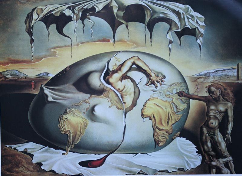 ART POSTER BY SALVADOR DALI **|**|** 36X24 INCHES; UNFRAMED; This poster is of Salvador Dali's painting Geopoliticus Child. It shows a human hatching out of an egg while a beast of some kind waits for it's birth. Along the bottom of this poster is the painting's title as well a Dali's signature. Salvador Dali is a Spanish artist best known for his surrealist paintings. He was also a surrealist filmmaker and writer. His most famous painting is The Persistance of Memory. He controversially refused to denounce facism in the years leading up to World War II insisting the surrealism had to exist apolitically. He died in 1989 in Catalonia of heart failure ; MSRP: $1500