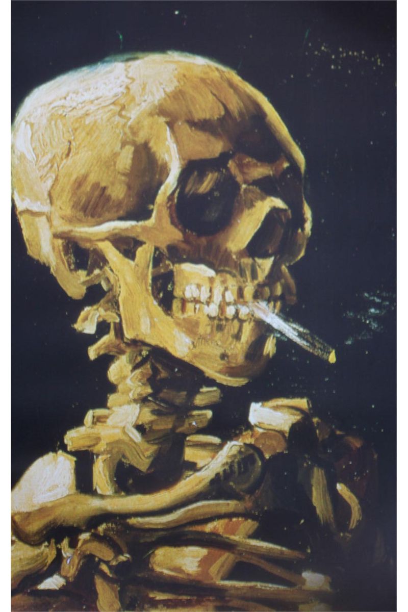 ART POSTER BY VINCENT GOGH **|**|** 24X36 INCHES; UNFRAMED; This poster is of Skull with Cigarette, by Vincent Van Gogh. It shows a skeleton smoking a cigarette. At the bottom it says 'Vincent Van Gogh, Skull with Cigarette, 1885'. Vincent Willem van Gogh (30 March 1853 - 29 July 1890) was a Dutch Post-Impressionist artist. Some of his paintings are now among the world's best known, most popular and expensive works of art. Most of his best-known works were produced in the final two years of his life, during which time he cut off part of his left ear following a breakdown in his friendship with Paul Gauguin. After this he suffered recurrent bouts of mental illness, which led to his suicide. His popular works include The Starry Night, Starry Night Over the Rhone, The Night Cafe, Bedroom in Arles, Sunflowers, Cafe Terrace at Night. ; MSRP: $1200