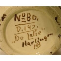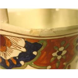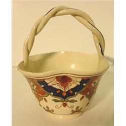 Art pottery handled basket with hand painted decoration. Marked on bottom. Has one minor chip on outer rim. 5.5" H, 4.25" Dia.