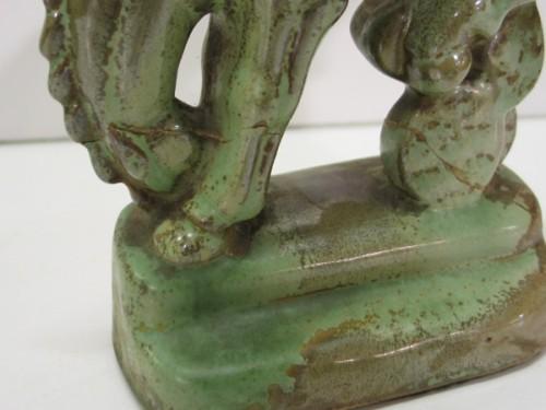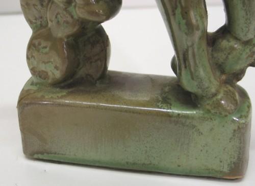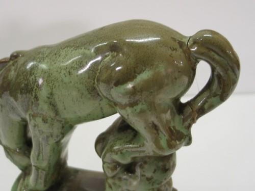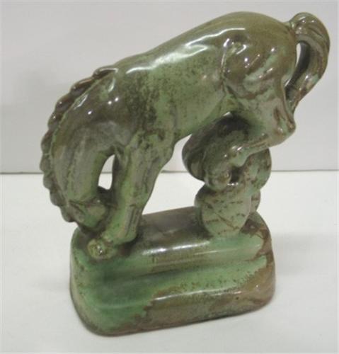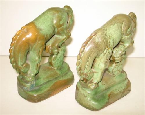 PAIR OF ART POTTERY HORSE FORM BOOKENDS. One bookend is chipped at bottom near horse’s front leg and one bookend has been repaired at two cracked areas near base. 5.25” H