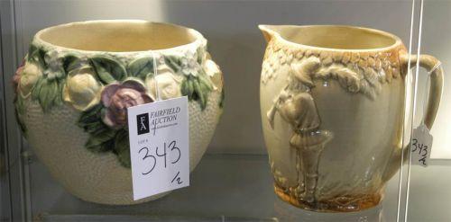 ART POTTERY JARDINAIRE AND ROSEVILLE PITCHER, each about 7" high, condition: jardinaire with roughness to base, PACKING AND SHIPPING (excluding insurance) $40,