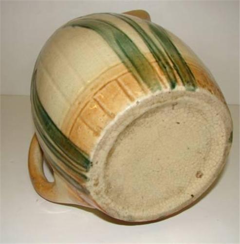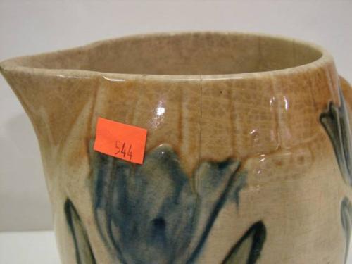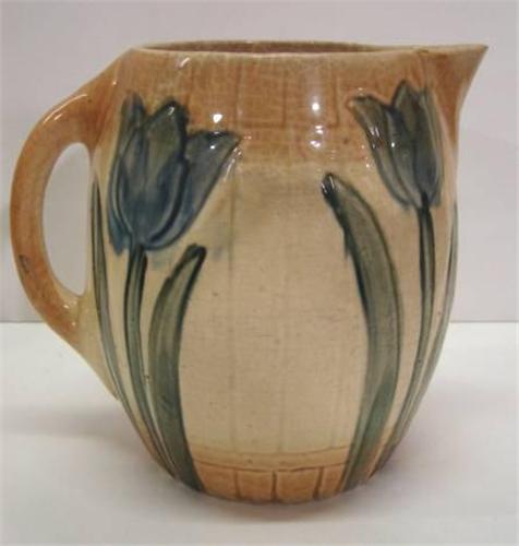 ART POTTERY PITCHER. Decorated with blue tulips around body. Has one vertical tight hairline crack on body. Shows crazing throughout. Unmarked. 7” H