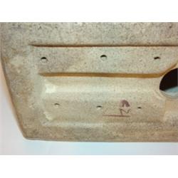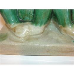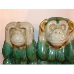 ART POTTERY STATUETTE OF 3 MONKEYS. See no evil, hear no evil, speak no evil themed. Green glaze to bodies of monkeys. Marked on bottom "A19B5". Signs of crazing throughout. 8" H, 12" W, 5" D