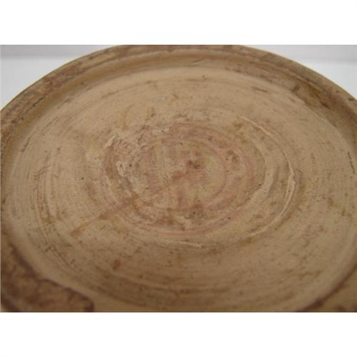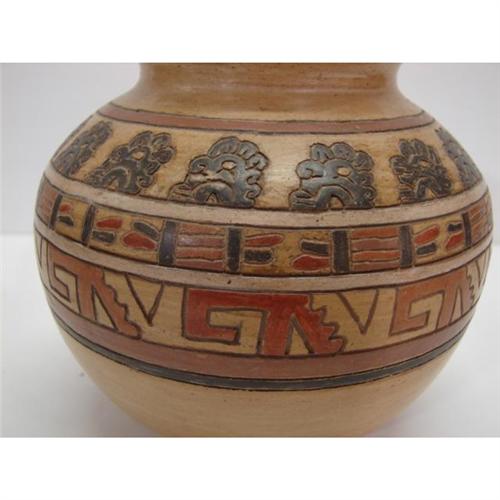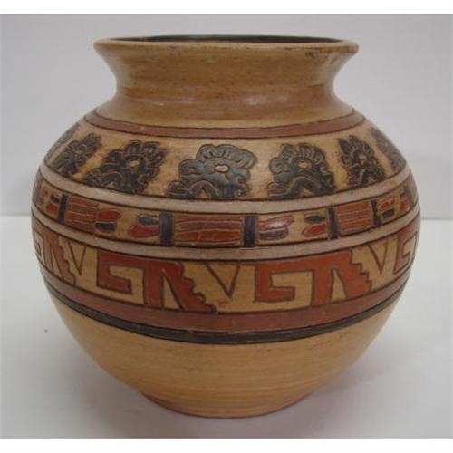 NATIVE AMERICAN ART POTTERY VASE. Incised rust, orange, black, & cream decoration around body. Marked illegibly on bottom with red circular stamp. 5.5” H