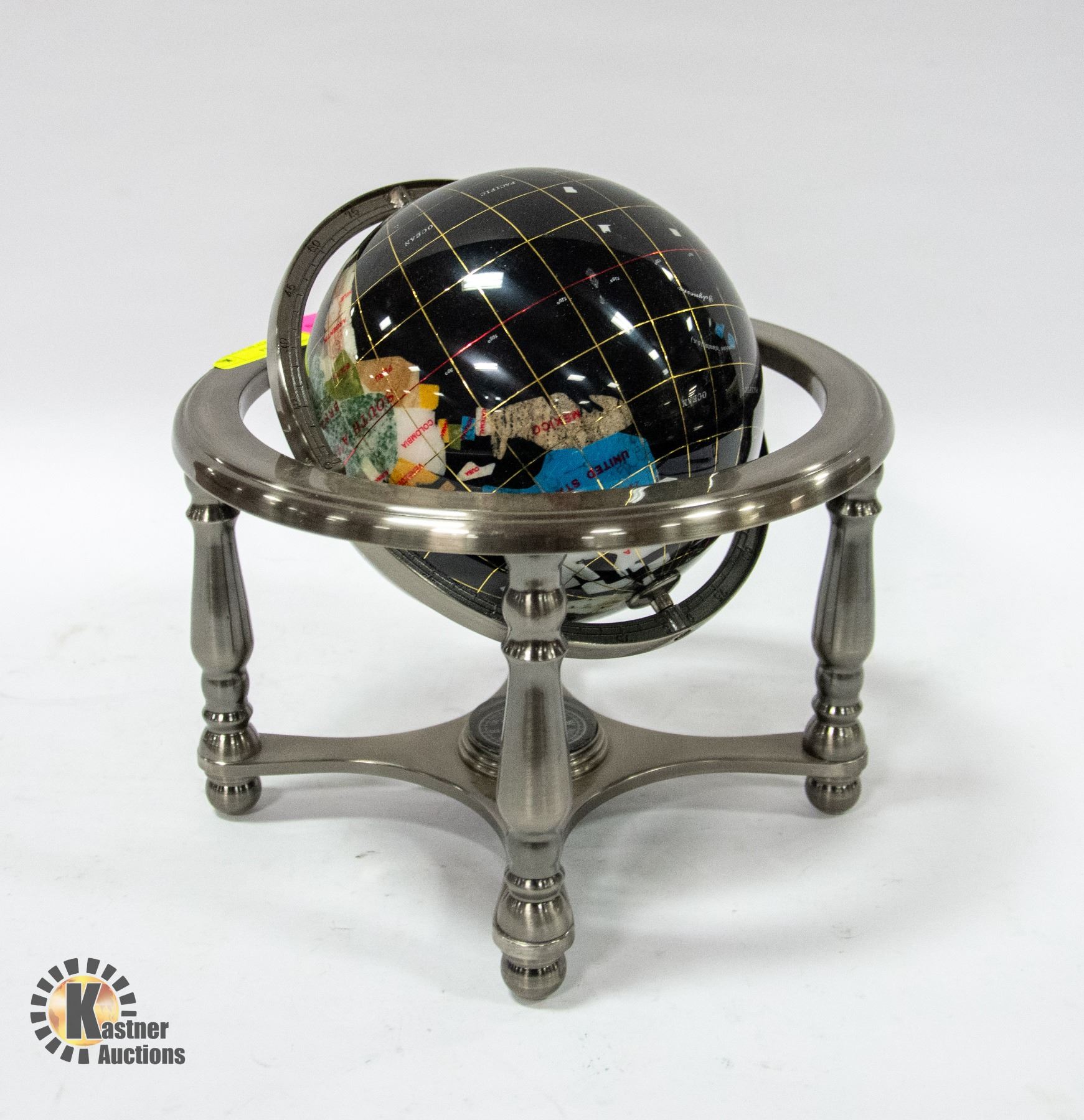 TOP BLACK ONYX OCEAN GEMSTONE WORLD GLOBE WITH SILVER TRIPOD STAND **ALL ITEMS MUST BE REMOVED BY 5PM SATURDAY, FEBRUARY 3RD 2024. ALL REMAINING ITEMS WILL BE SUBJECT TO A $6.00 PER DAY STORAGE CHARGE. ANY ITEMS REMAINING AFTER MONDAY, FEBRUARY 19TH, 2023 WILL BE CONSIDERED FORFEITED. NO REFUNDS WILL BE ISSUED FOR FORFEITED ITEMS. TO SCHEDULE A PICK UP APPOINTMENT CLICK HERE