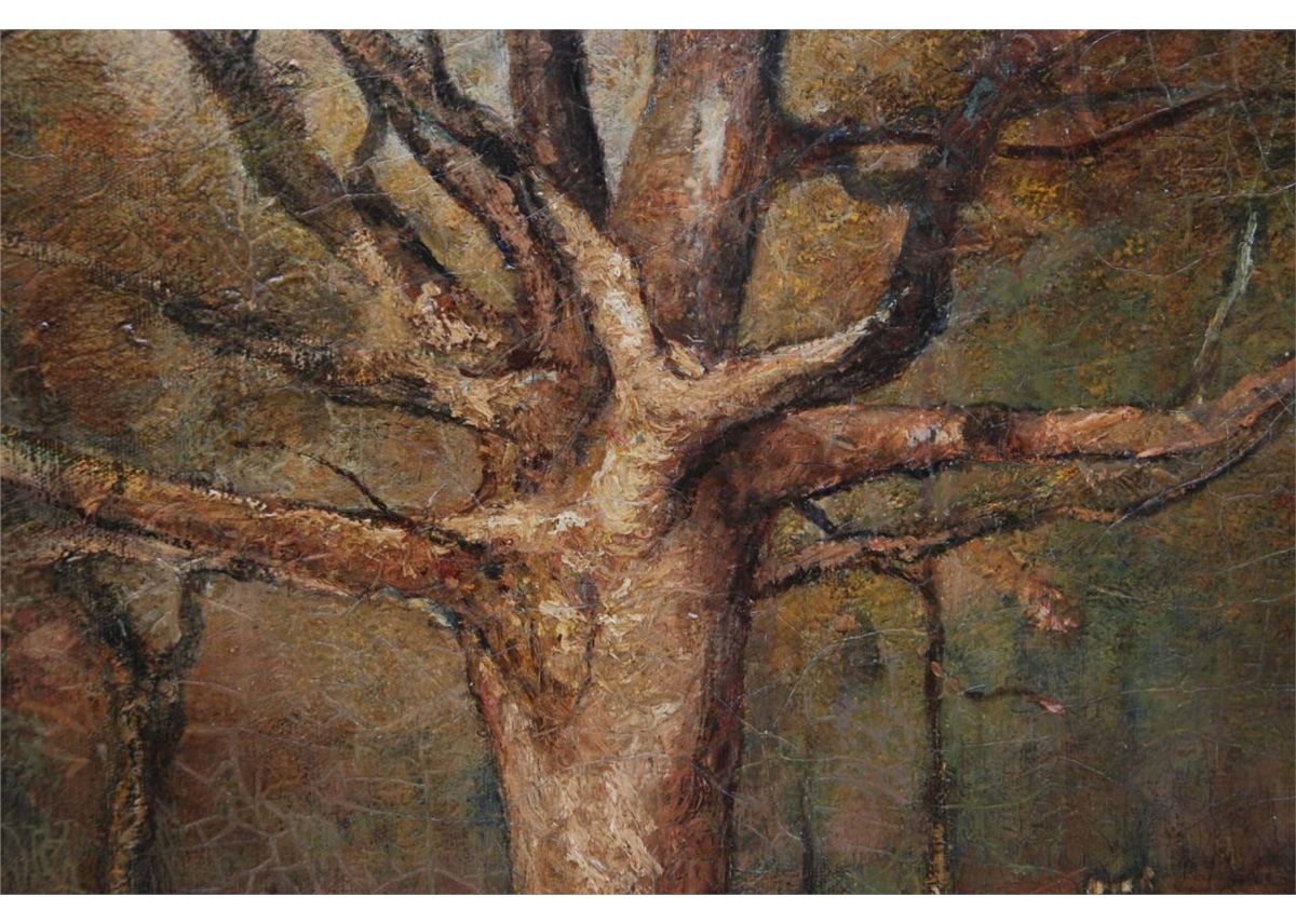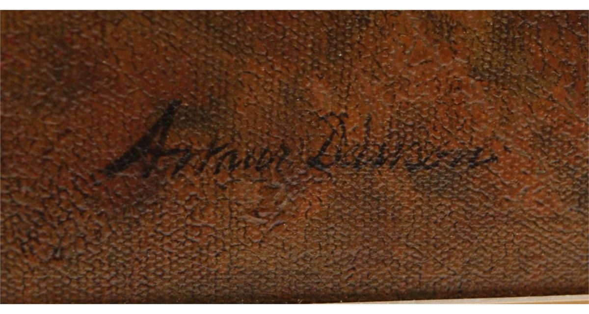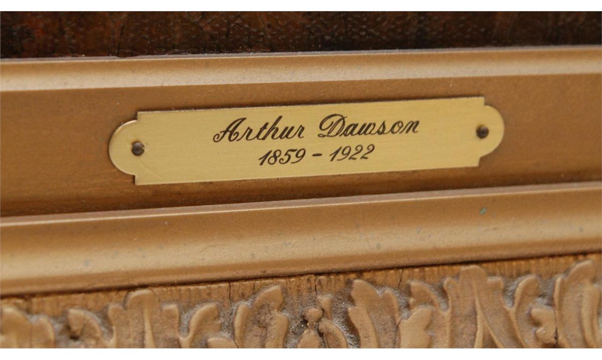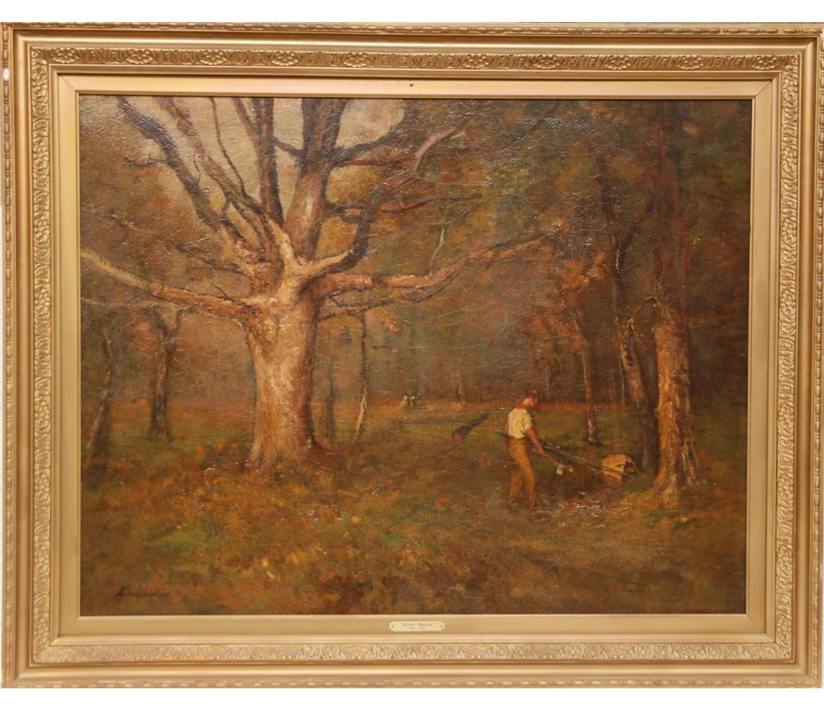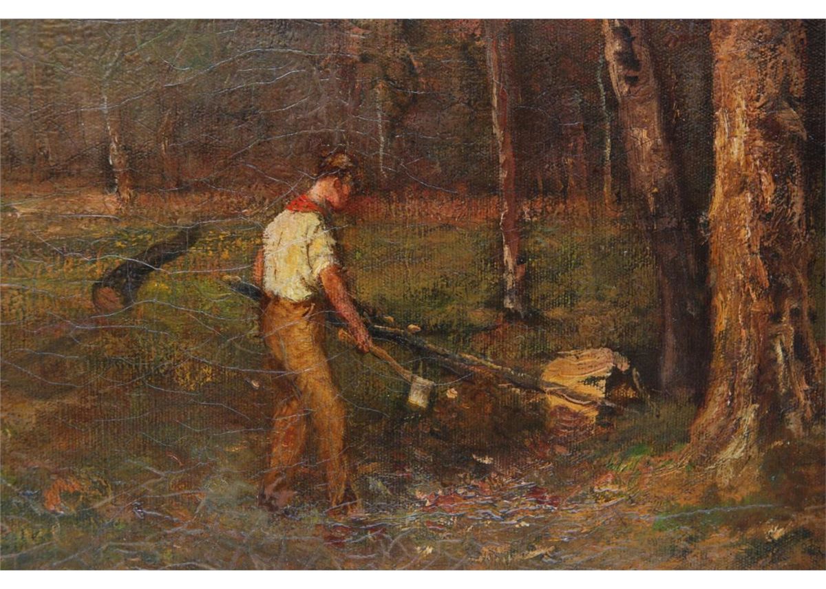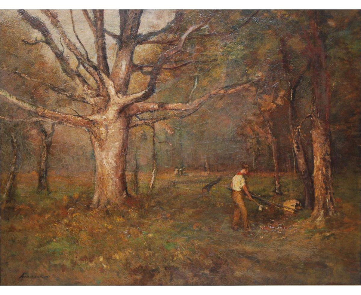 Arthur Dawson (AMERICAN, 1858-1922) oil painting on canvas depicting a man "Cutting Trees". Signed to lower left. Mounted in gold frame with name plaque to lower center. Measures 28 1/4" x 36" width + 3 1/4" frame (71.7cm x 91.4cm + 8.2cm). Provenance: Has Christie's Appraisal. Sam Feldman Collection.