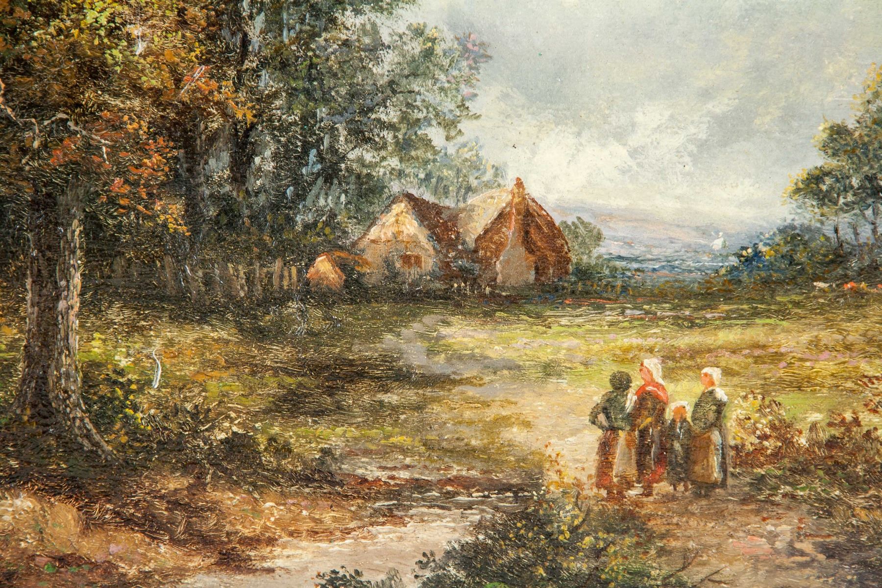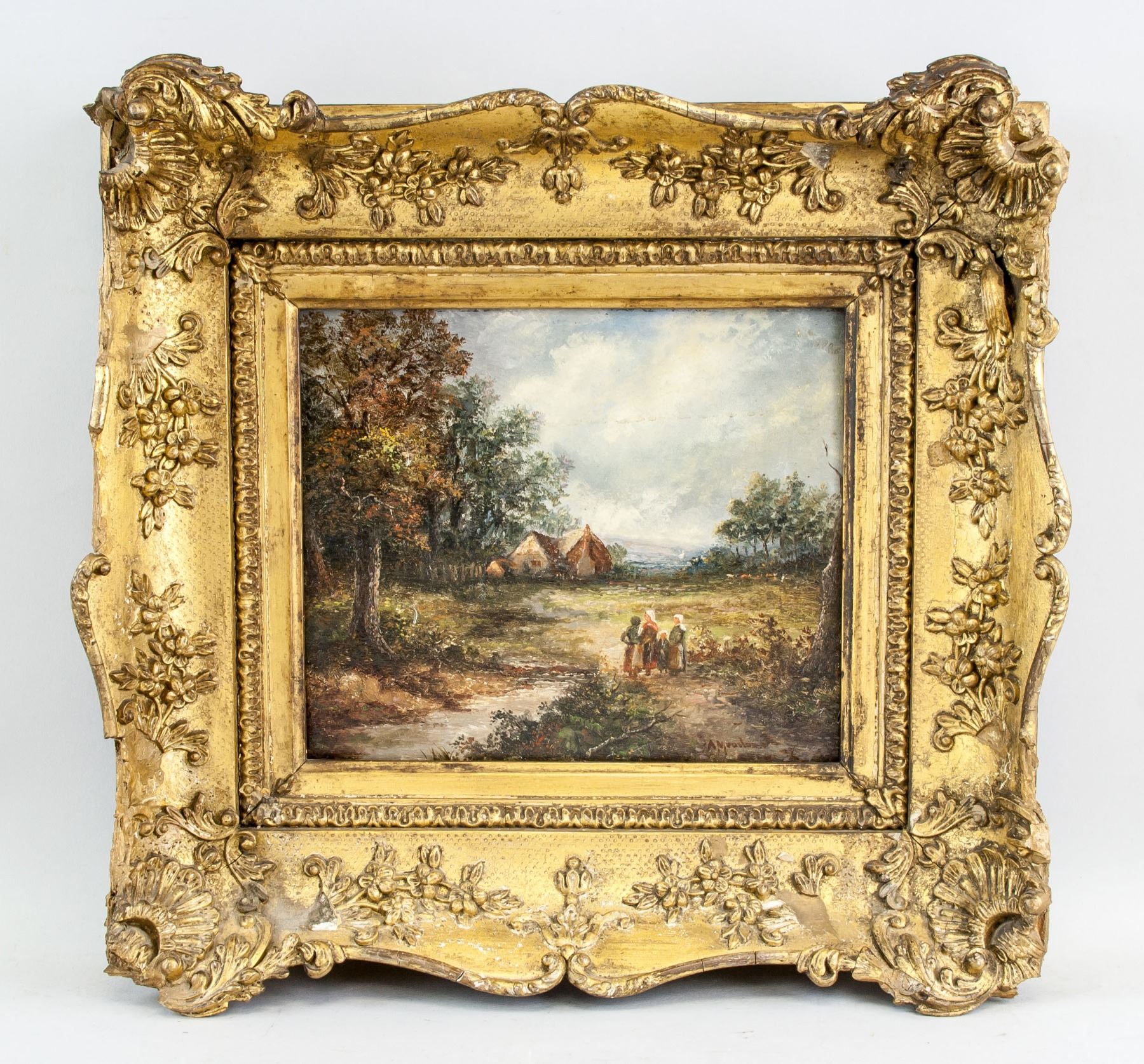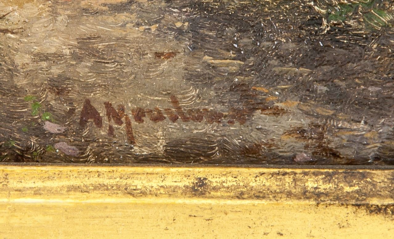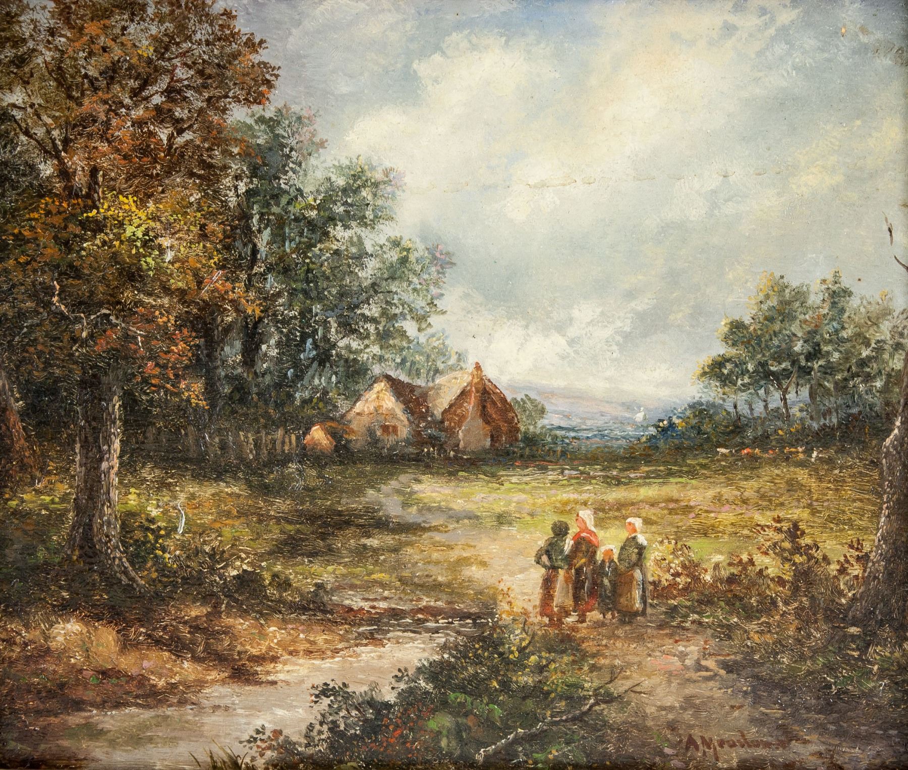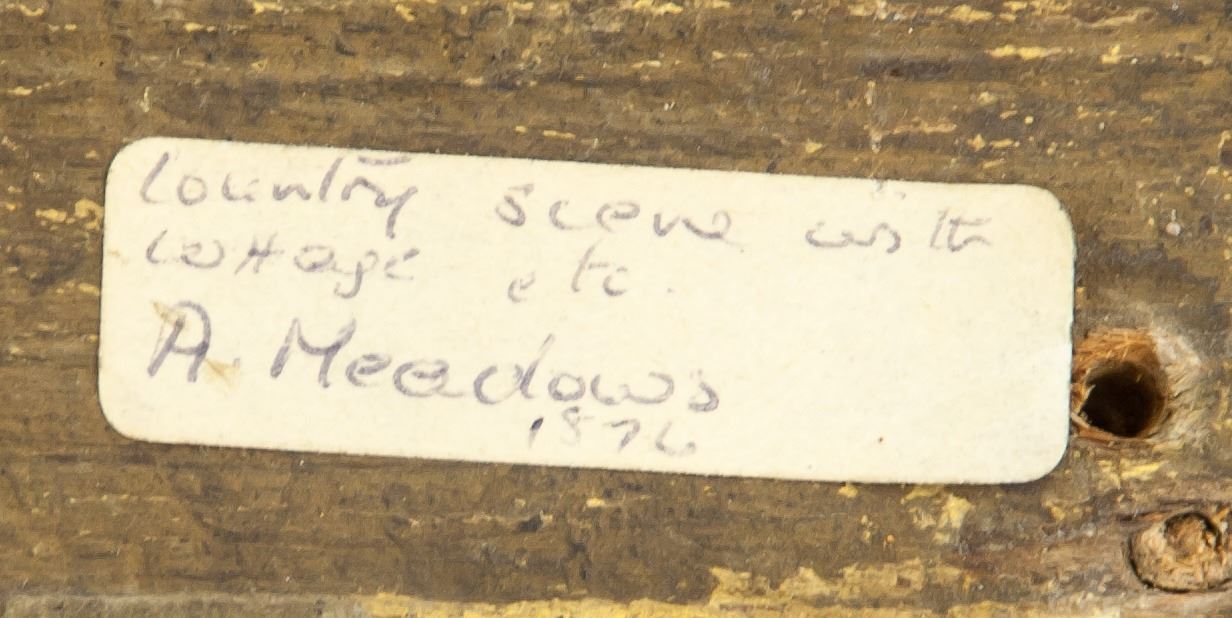 Oil on board. Featuring landscape scene with cottage. Signed and attr. Arthur Joseph Meadows (British, 1843-1907. Dated 1876 with gallery label on verso. 7.5 x 8.7 in. (19 x 22 cm). Arthur Joseph Meadows was a painter of coastal scenes and marines who was greatly influenced by Clarkson Stanfield. Arthur Joseph is generally considered to be the best of the Meadows family of marine artists, he was the younger brother of James Edwin Meadows Jnr. and the son of James Meadows Snr. His work compares favourably with most of the major nineteenth century maritime painters producing seas, which look as if they might be subject to all the vagaries of the tidal forces. He had the ability to convey the depth and immensity of the ocean. His shoreline scenes with beached boats lying close to the waters edge, while fishermen unload their catch, were also very effectively executed. Meadows painted harbours and coastal scenes in England, France and Holland. He exhibited mainly at Suffolk Street as well as at The Royal Academy 1863 - 72, and The British Institute between 1863 and 1867. Meadows’ paintings can be found in many museums and art galleries including The National Maritime Museum.