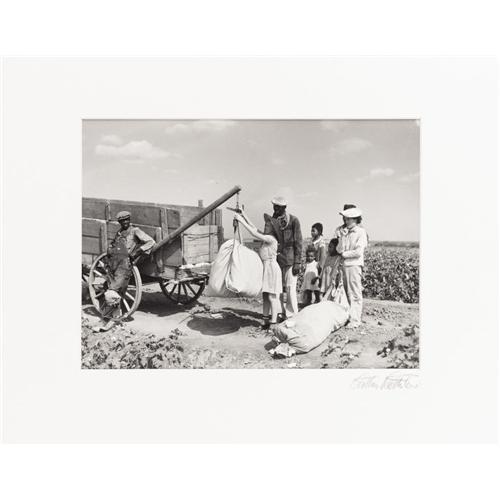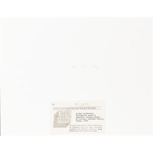 <B>ARTHUR ROTHSTEIN</B></I> (American 1915-1985)<BR><I>Plantation, Owner's Daughter Checks the Weight of Cotton, Kaufman County, Texas</B></I> <BR>Negative made 1936, printed by the Library of Congress in 1976, <BR>archivally washed and selenium toned by Steve Satterwhite who initialed on reverse<BR>Gelatin silver print<BR>9-1/2 x 7 inches (24.1 x 17.8 cm)<BR>Signed on matte: <I>Arthur Rothstein</B></I> <BR><BR>Provenance:<BR>The Collection of Mrs. Rowena Nadig (San Antonio, Texas)<BR><BR>Exhibition:<BR>The Witkin Gallery Inc., New York, New York <B>Condition Report:</B> Normal signs of wear as appropriate with age<BR><BR><b>Shipping:</b> Requires 3rd Party Shipping (<a target="_blank" href="http://www.heritageauctions.com/common/shipping.php">view shipping information</a>)