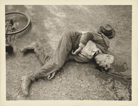 (1899 - 1968) Photographer and photojournalist, known for his stark black and white street photography. Weegee worked in the Lower East Side of New York City as a press photographer during the 1930s and '40s, and he developed his signature style by following the city's emergency services and documenting their activity. Much of his work depicted unflinchingly realistic scenes of urban life, crime, injury and death. Untitled, unpublished silver gellatin photograph, 7¾ x 10 in., a New York City accident or crime scene with a man crumpled upon the pavement, suffering from what appears to be a fatal head injury. Inkstamp on verso: "Please Credit Weegee From Photo-Representatives." Fine condition.