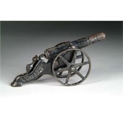 ARTILLERY BATTERY CANNON. Unknown maker, ca. 1890's. Shoots .22 caliber blank. Black enamel cannon embossed with patent information on top of barrel, "Artillery" on one side "Battery Cannon on other. A very difficult cannon to find. SIZE: 7". CONDITION: Retains much of original black enamel. MC 1-4211 (400-600)