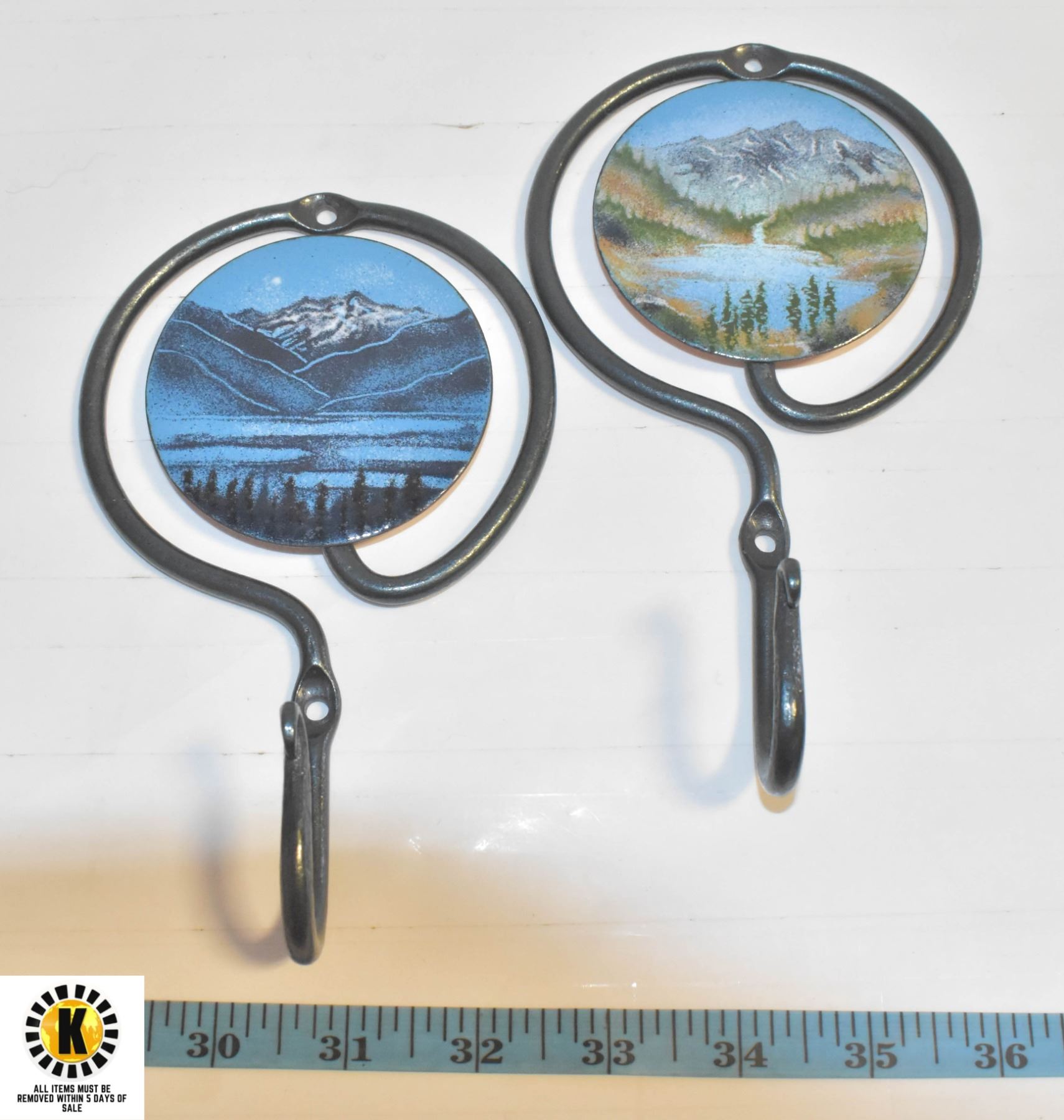 BY CANADIAN ARTIST LORNA ROBIN. COPPER AND GLASS ENAMELING MOUNTAIN WALL ART PAINTING. COAT, HAT, PURSE, JEWELRY HOOKS.