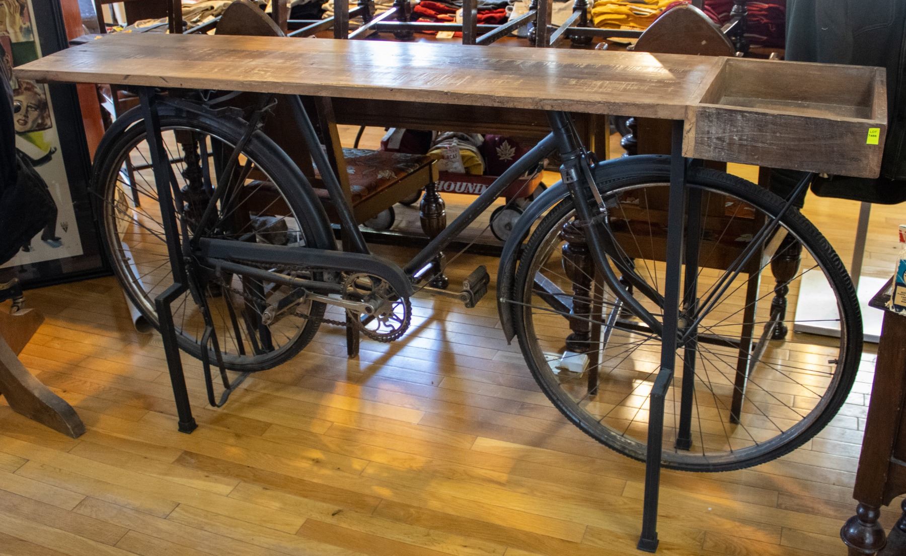 ARTIST BUILT BICYCLE WOODEN SIDE TABLE WITH STAND