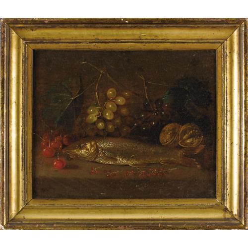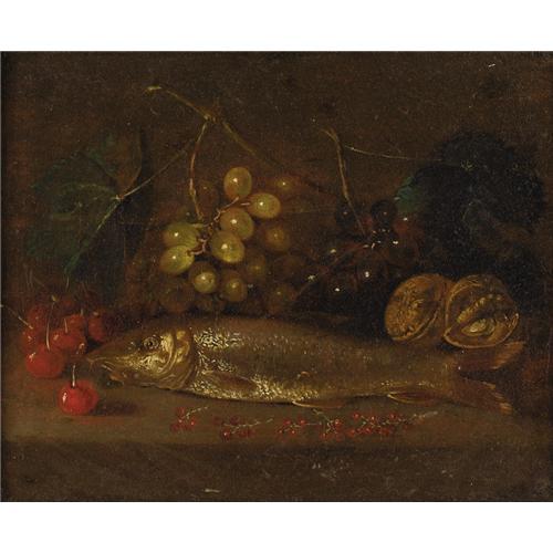 <B>FRENCH SCHOOL</B></I> (Eighteenth Century)<BR><I>Still Life With Fish, Cherries, Walnuts And Grapes</B></I><BR>Oil on canvas<BR>13 x 16 inches (33 x 40.6 cm)<BR>Unsigned<BR><BR> <B>Condition Report:</B> relined, surface cleaned (thin surface)<BR><BR><b>Shipping:</b> Requires 3rd Party Shipping (<a target="_blank" href="http://www.heritageauctions.com/common/shipping.php">view shipping information</a>)