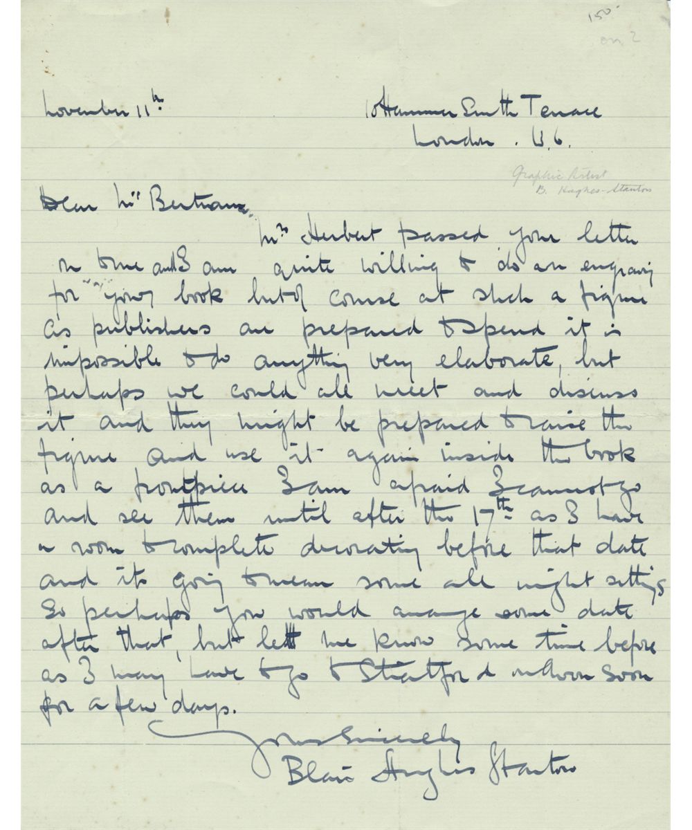 Good lot of two items signed by British engravers, includes: BLAIR HUGHES-STANTON (1902-1981), A.L.S. 1p. 8vo., London [n.d.]: "I am quite willing to do an engraving for your book but of course at such a figure as publishers are prepared to spend it is impossible to do anything very elaborate...", with a printed copy of Waler de la Mare's poem Alone bearing a colored Hughes-Stanton engraving within, and; JOHN SARTAIN (1808-1897) British-born pioneer of mezzotint engraving, D.S. 1p. 12mo., Philadelphia, July 8, 1874, a pay order signed by him as secretary of the Pennsylvania Academy of the Fine Arts. Two pcs.
