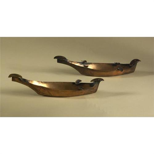 COPPER: A pair of copper boat canoe form Arts and Crafts ash trays, unattributed, Native American style detailing, patinated, two of the cigarette holders are missing from one, 9''.