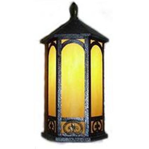Great Arts and Crafts style wall mount lantern. The lantern is made of a thick sheet metal and baked enamel decorated in "hammered metal" look. There are two color combinations - the hexagon shaped body with brass finial has a "hammered pewter" finish, the ornaments in lower part have "hammered bronze" finish. There are six butterscotch yellow stained glass panels, including one on the bottom of the lantern. The base frame is hinged with a screw mount. This lighting fixture was removed from a mansion built in 1916. It was used as the outdoor entrance lighting. It is in very good working condition. There is some fine white latex paint spatter, which can be easily removed. The wall mount plate and 2 supporting brackets also have "hammered pewter" finish. Dimension : 19" high x 8-3/4" diameter x 10-1/2" deep. The weight is approximately 10-15 pounds. If desired, 3 more identical lanterns are availble. Please note that in some cases photo sizes are automatically reduced, so if you want to see full size or detailed pictures, please email us.