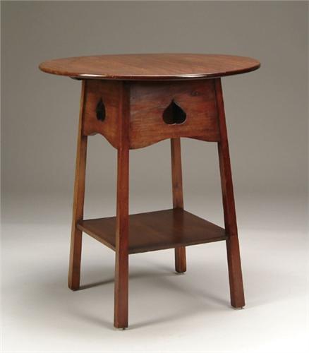 ARTS and CRAFT MAHOGANY TWO TIER STAND BY LIBERTY and CO. Round top stand has four square splayed legs which support a mid section square shelf. 8in. shaped skirt has upside down heart cutouts. Circa 1905. Unsigned. SIZE: 25in. dia x 27-1/2in. h. CONDITION: Refinished, very good. 9-26607