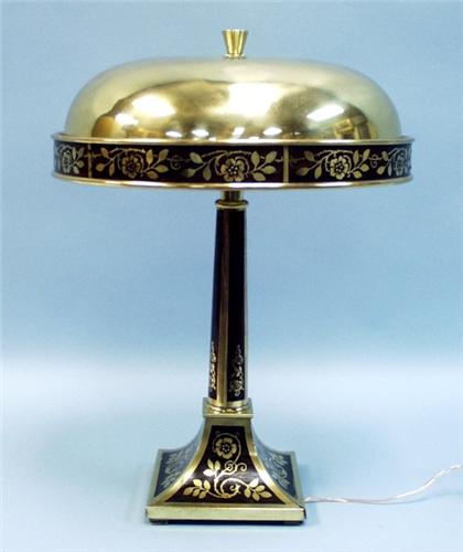 ARTS & CRAFTS - A brass and wood table lamp with inlaid floral decoration on the base and a circular brass shade. Marked. 19" high, 13 1/2" diameter. Circa 1900.