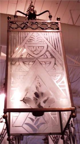 ARTS & CRAFTS - A rare pair of gilt bronze framed lanterns fitted with frosted art glass side panels. The square shaped bronze frame with grill work decorated sides. The glass panels are acid etched with geometrical designs. 15" square and approximately 47" long. Circa 1900. 12000-14000
