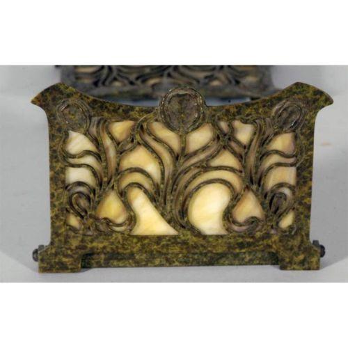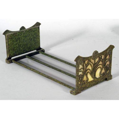 ARTS & CRAFTS COPPER BOOK RACK with verdi patina, 4" high, 6" wide, 13" long, unsigned, circa 1910, CONDITION REPORT: no problems. PACKING AND SHIPPING: We offer packing (double boxed in most cases) and shipping of this item within the Continental United States by USPS or UPS (our choice- boxes over 30lbs or oversized may be recalculated based on buyer's location), NOT INCLUDING INSURANCE (it will be added when we know the sales price) for $20