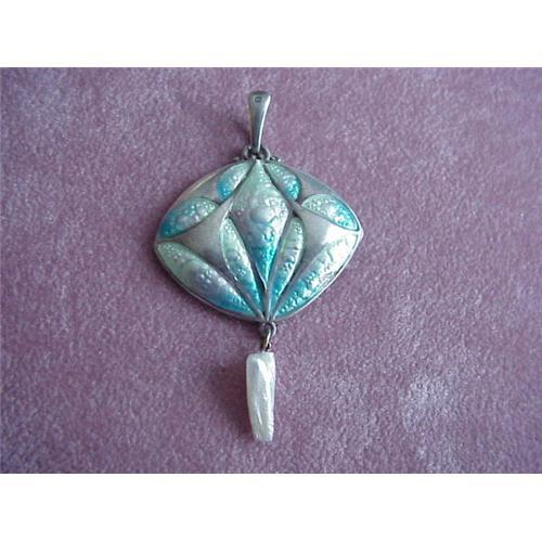 <table width="100%" border="0" cellspacing="0" cellpadding="4"><tr><td><em> </em></td></tr><tr> <td width="100%"> Choice original Arts and Crafts English enamel pendant with such a Libery & Company look. This is a lovely example with hammered silver that portions are enamelled in blues, turquoise, light pale greens and silvery white-just breathtakingly beautiful. A gorgeous fresh water pearl drops from the centre playing up the lustrous enamelware, a beautiful touch. It is hallmarked for Birmingham 1909, the maker�s marks look to be S & H. The pendant measures a very impressive size: 2 inches in length by 1 ¼, in superb condition, even the jump ring is hallmarked. A most beautiful example of Arts and Crafts jewelry. </td></tr><tr> <td> </td></tr><tr> <td>Reference #: GAVJ399</td></tr><tr><td>Condition:Excellent!</td></tr><tr><td>Year:1909</td></tr><tr><td>Title:ARTS & CRAFTS ENAMEL PENDANT LIBERTYS </td></tr><tr><td>Location:WA</td></tr></table>