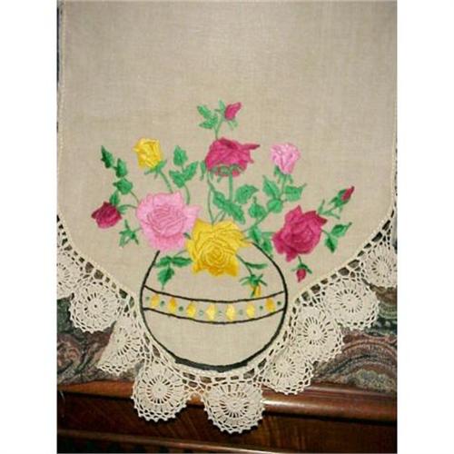 Beautiful table or buffet runner, made from strong linen and hand embroidered with satin-silky thread, in gorgeous vibrant colors, depicting pink,burgundy and yellow roses and edged with lovely crocheted lace - as per images.measures about 45" long and 19 1/2" wide, Excellent condition - US Buyer to pay 5.00 for shipping plus insurance.Thanks.
