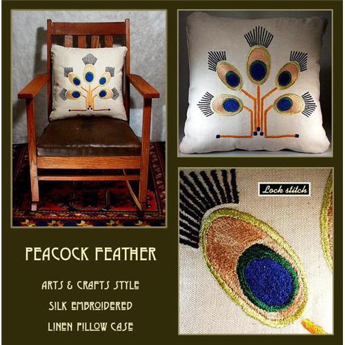 Our exclusive - not available by any other seller, Gallery or Studio. Outstanding Arts & Crafts / Mission style "PEACOCK FEATHER" decorative pillow case!! This pillow will immediately enhance the character and charm of any room in which it is placed. This design was hand drawn, hand traced and embroidered on an old Singer sewing machine, using what I believe is called "lock stitch". This type of embroidery will not run, like "straight" stitch. There is no (much less expensive) stenciling or appliqué used in this process. Pillow is 18" x 18" and embroidered on a fine canvas linen. The (more expensive) addition of a zipper on one seam allows for each owner to independently choose their own filling, while also making cleaning far easier. No Arts & Crafts home is complete without the addition of fine pillows. Please note that this auction is for the pillow case only. We are also able to offer custom made curtains, table runners as well as other textiles based on your own design. Please contact us for further information. Please note that in some cases photo sizes are automatically reduced, so if you want to see full size or detailed pictures, please email us ().