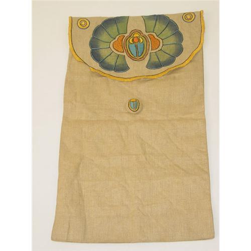 ARTS & CRAFTS PAINTED & EMBROIDERED LINEN POUCH W/ EGYPTIAN STYLE DECORATION INCLUDING SCARAB BEETLES (21" X 12" W/ FLAP CLOSED) - LIGHT WEAR, WRINKLES, IMPERFECTIONS