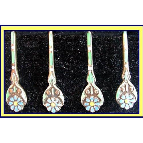 Set of 6 demitasse / teaspoons made of enameled sterling silver in the Arts and Crafts style. Birmingham, England 1924. Come in original fitted box.<BR>Each spoon is 3 5/8inches long.<BR>Might have come straight out of Liberty & Co. Strong Arts and Crafts influence seen in the floral theme of blue, green, yellow and white enamel.<BR>Original box with brass clasp in good condition and silk and velvet lining mint.<BR>Each spoon is hallmarked on the back: Maker T&S, Birmingham, Sterling mark and date mark Z (1924).<BR>Excellent condition of the enamel indicates that the spoons were never used. However one spoon has a slightly bent bowl.