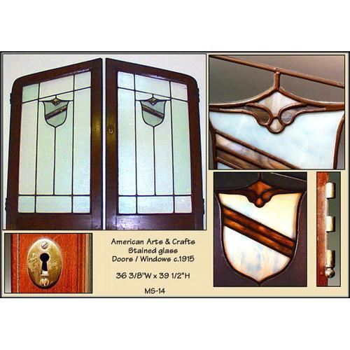 Great Arts and Crafts pair of stained glass doors. These doors were removed from built-in bookcases in a Arts and Crafts bungalow, built in 1916. The frame appears to be dark mahogany stained walnut, the glass panels are mounted in copper, unlike in the less expensive lead mount. Original lock and brass hinges. Overall dimension of both doors butted together: 36 3/8" high x 39 ½" wide. Very good condition, no cracks in the glass. We have another identical pair, so if you are interested, please inquire. Lighting (Arts & Crafts) fixtures also from the same house are listed separately, see our other Auctions. For Ebay Live Auctions photo sizes are automatically reduced (and distorted), so if you want to see larger more detailed pictures, please email us.