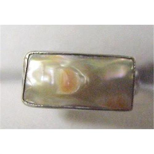LOVELY STERLING AND PEARL RING WITH TINY BLISTER PEARL SUROUNDED WITH RAINBOW PEARL COLOR, as per images.SIZE SMALL - 5. TOP OF THE RING MEASURES 1/2" LONG X 1/4".