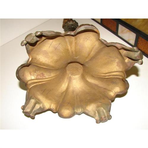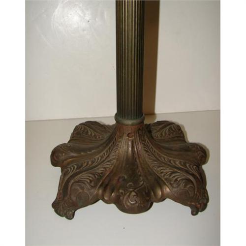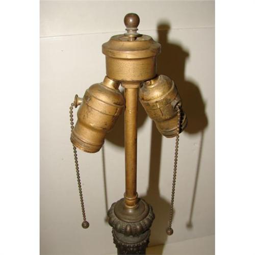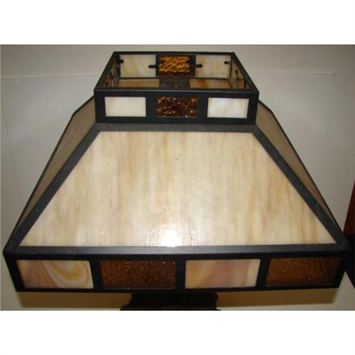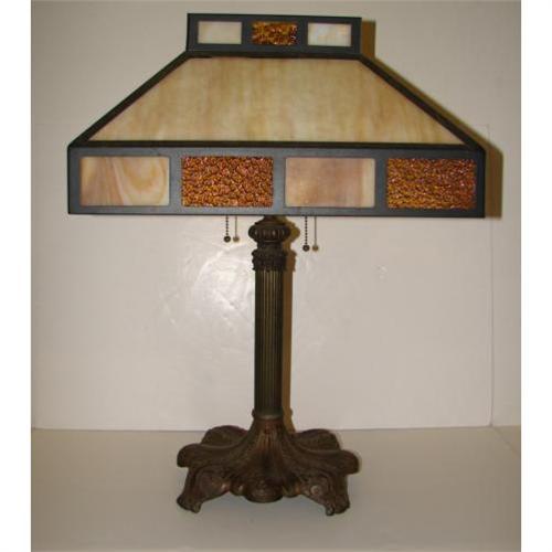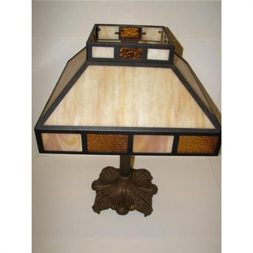 ARTS & CRAFTS STYLE LAMP. Arts & Crafts style four-sided slag glass shade with 32 amber glass and white and amber marbleized glass panes. Art Deco style columnar two-light lamp base. Lamp is electrified but is missing electric cord. 24” H