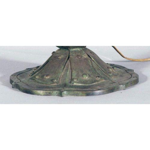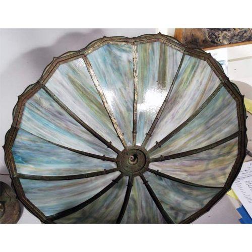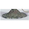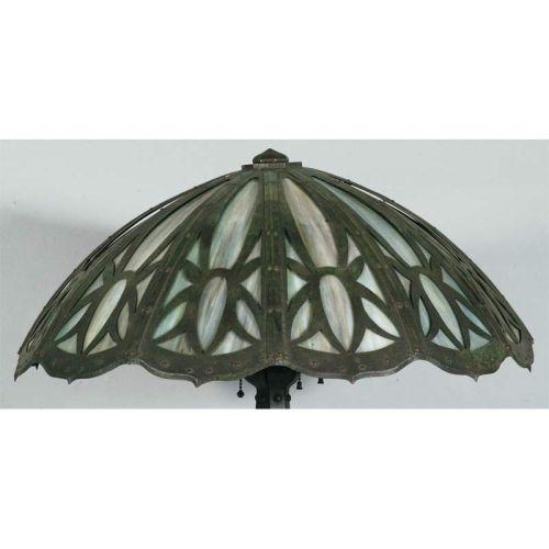 ARTS & CRAFTS TABLE LAMP with strapwork base and panel glass shade 24" diameter, 26" high, circa 1915 CONDITION REPORT: glass excellent, shade cap frozen to shade, base with patina loss and oxidation, but very presentable.