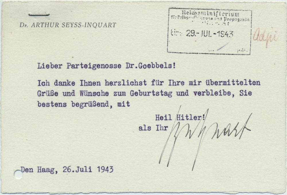 (1892 - 1946) Nazi occupation governor of Holland and deputy governor of Poland, executed as war criminal. Fine association T.L.S. on his personal correspondence card, 1p. 12mo., the Hague, July 26, 1943 to Minister of Propaganda JOSEPH GOEBBELS thanking him for having sent best wishes upon the occasion of Seyss-Inquart's birthday. File and staple hole, stamp receiving docket at top, else very good.