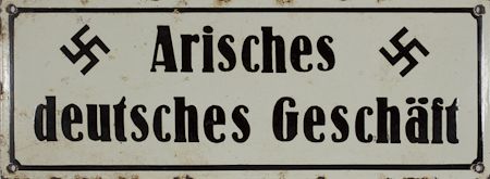 An evocative symbol of Nazi Germany's race laws, a 12 1/2" x 4 3/4" porcelain sign with two swastikas and slightly raised lettering reading: "Arisches deutsches Geschaft" ("Aryan German Business"). A hole in each corner (which show use) are present to affix the sign outside a business premises. Such signs were employed to indicate to potential customers that the business owner was a non-Jew, and therefore not subject to the boycott of Jewish goods commenced by the Nazis in March, 1933.