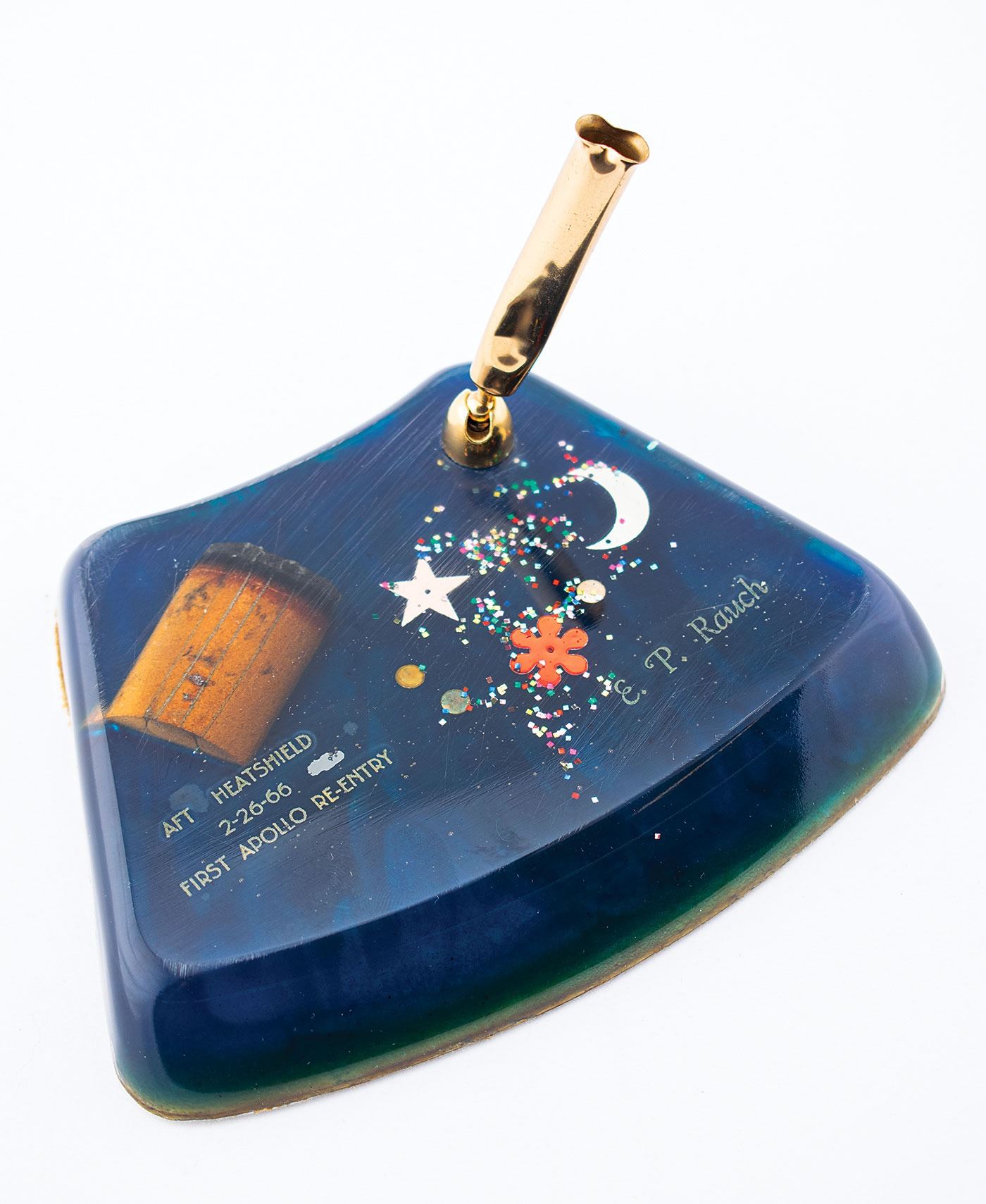Rare acrylic display containing a piece of aft heat shield from the AS-201 (CSM-009) spacecraft, which launched from Cape Kennedy LC-34 on February 26, 1966, and splashed down 37 minutes later in the South Atlantic Ocean. The fragment measures 1.5˝ x 1˝ x .5˝ and is encased in an embellished 6˝ x 4.25˝ x .75˝ Lucite pen holder presented to E. P. Rauch, an employee at Rockwell International Corp. In fine condition, with slight scuffing, and some dents to metal pen holder. AS-201 was the first uncrewed test flight of an entire production Block I Apollo command and service module and the Saturn IB launch vehicle. The suborbital flight was a partially successful demonstration of the service propulsion system and the reaction control systems of both modules, and successfully demonstrated the capability of the command module's heat shield to survive re-entry from low Earth orbit.