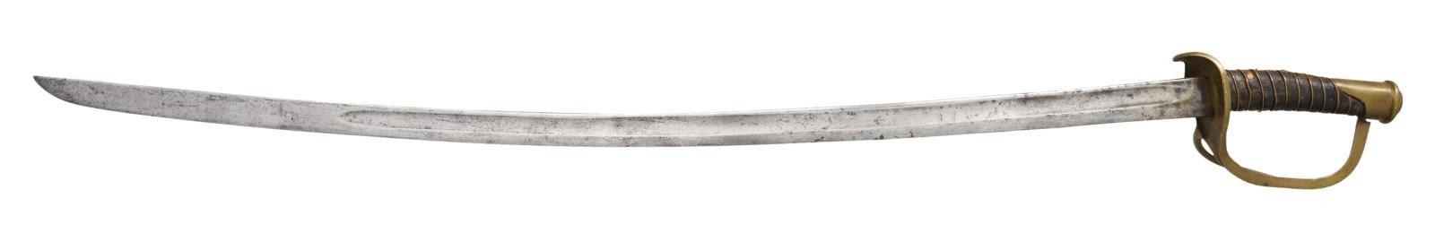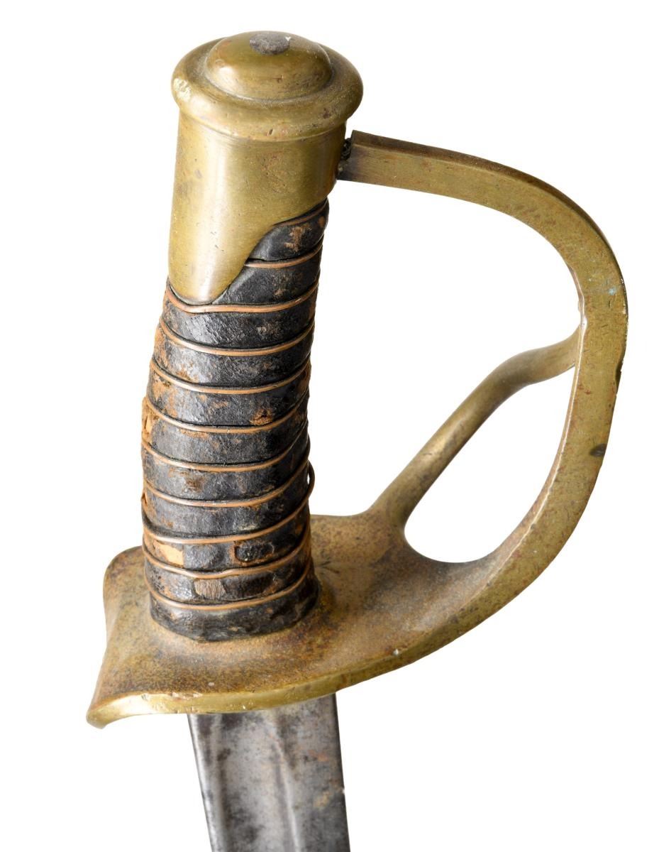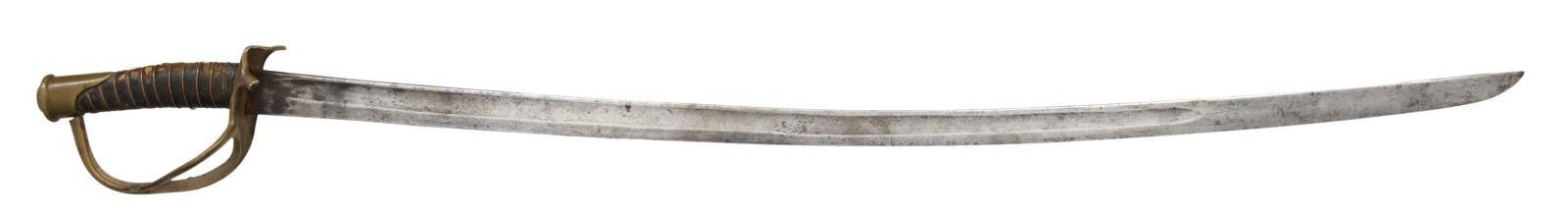 SABER. 35.25" unstopped fuller blade. Hilt has outer branch broken off and used that way based on well patinaed break. Boyle & Gamble sabers are scarce as they were best known for making officer swords. Boyle & Gamble made high quality swords & sabers, more refined than most Southern makers. CONDITION: very good as used, grip retains over 90% original black dyed leather and single strand copper wire wrap. (02-19167/JS) $1,200-1,500.
