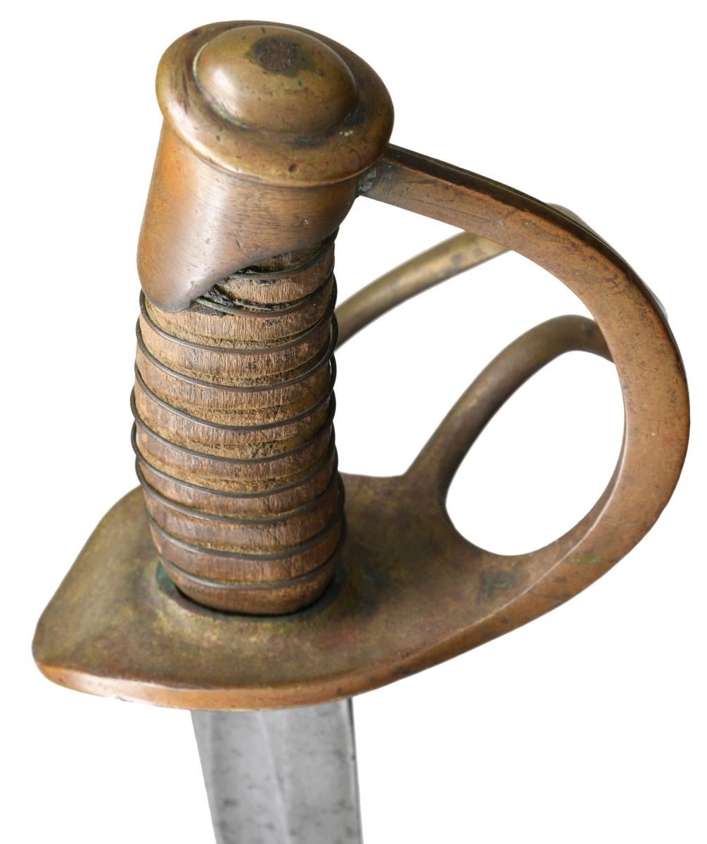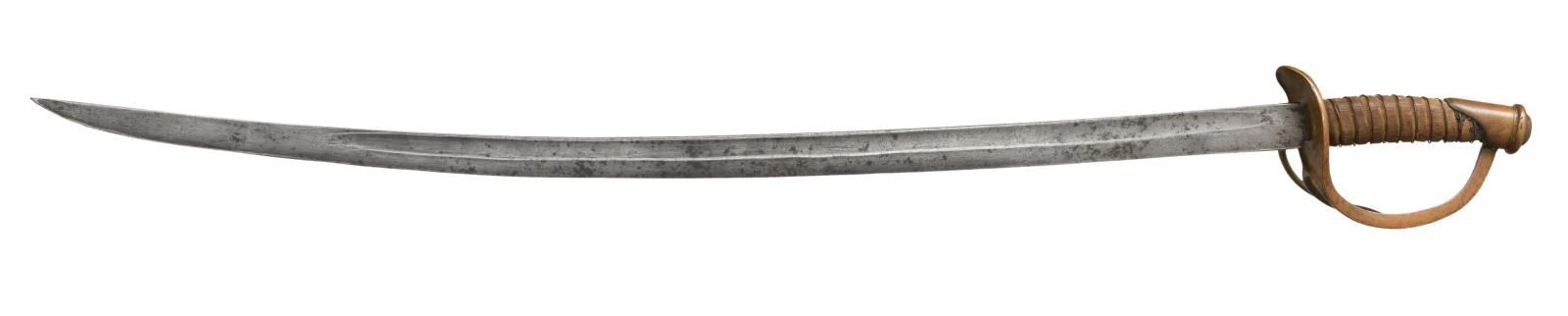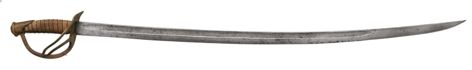 35.5" wide heavy unstopped fuller blade, carved wood grip missing most all leather but retains original brass wire wrap. CONDITION: blade is gray with staining, wood grip dry with long crack, brass hilt, pommel & wire have coppery patina. Quillon has dent & bend. (02-19168/JS). $1,500-2,000.