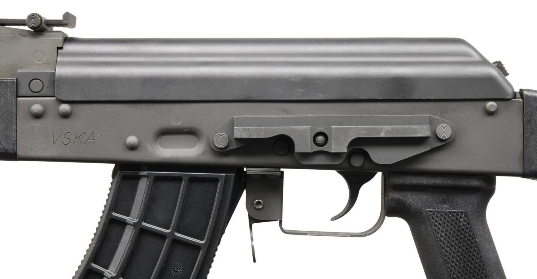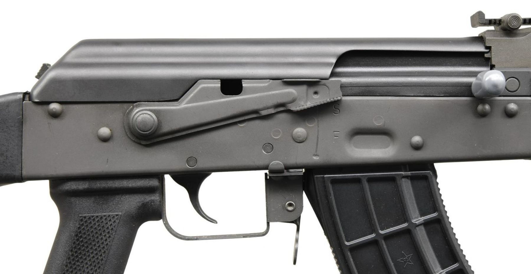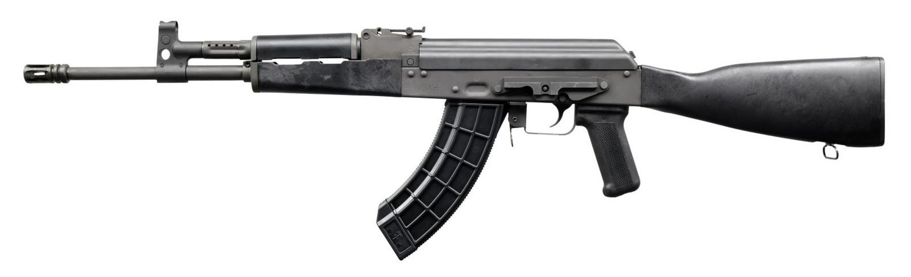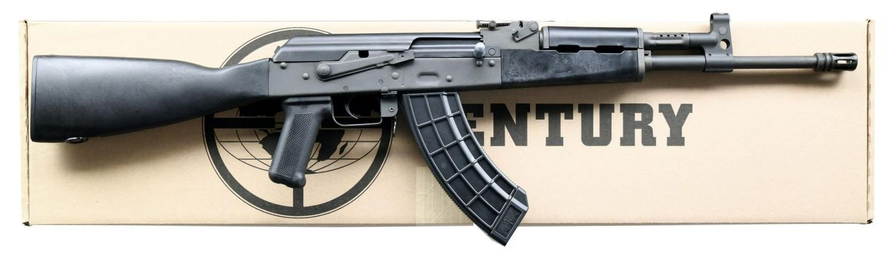 Cal. 7.62x39mm. S# SV7074380. Bbl. 17". American made AK-47 variant made by Century Arms. Bolt carrier, front trunnion, and feed ramp machined from S7 tool steel. Threaded barrel terminated w/ AR-15A1 style flash hider. Adjustable hooded post front sight. Rear tangent sight adjustable from 100-800 meters. Stamped receiver w/ left side scope mount. Black plastic furniture. Right side charging handle w/ open bolt notch. Dark grey parkerized finish on all exposed metal surfaces. MAGS: 1 US Palm 30 rd. UNATTACHED ACCESSORIES: factory box & paperwork. CONDITION: all aspects indicate as new in box. No visible blemishing. Never sold retail. Bright bore w/ strong rifling. Fire control mechanism appears to function correctly when cycled by hand. PROVENANCE: The Collection of Gun Sport Ltd owned by Jon R. Thomas. (23-3468/JZ). MODERN. $800-1,200.