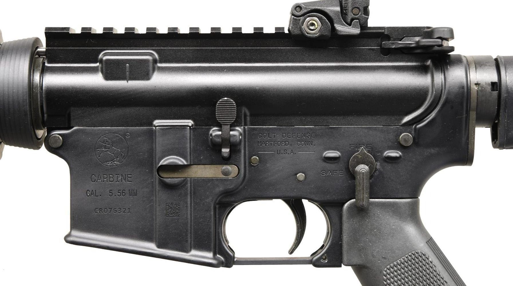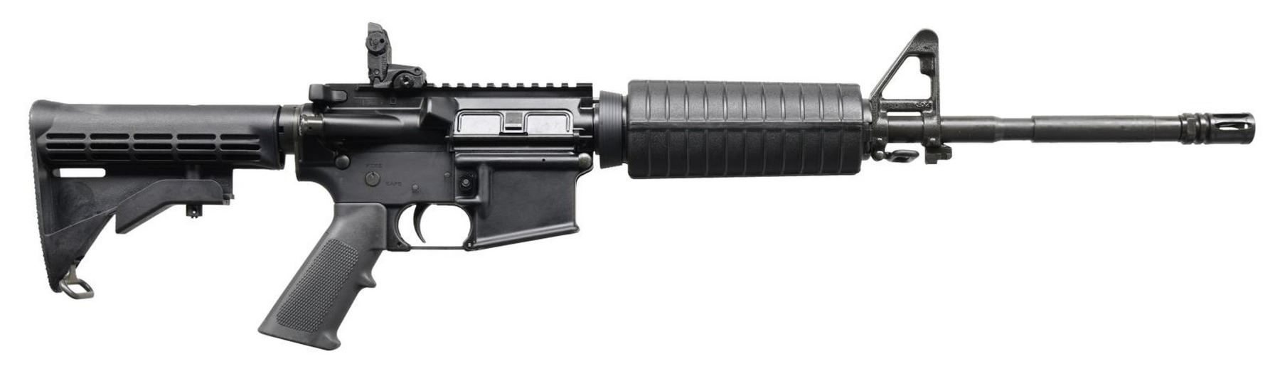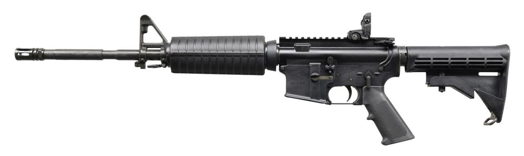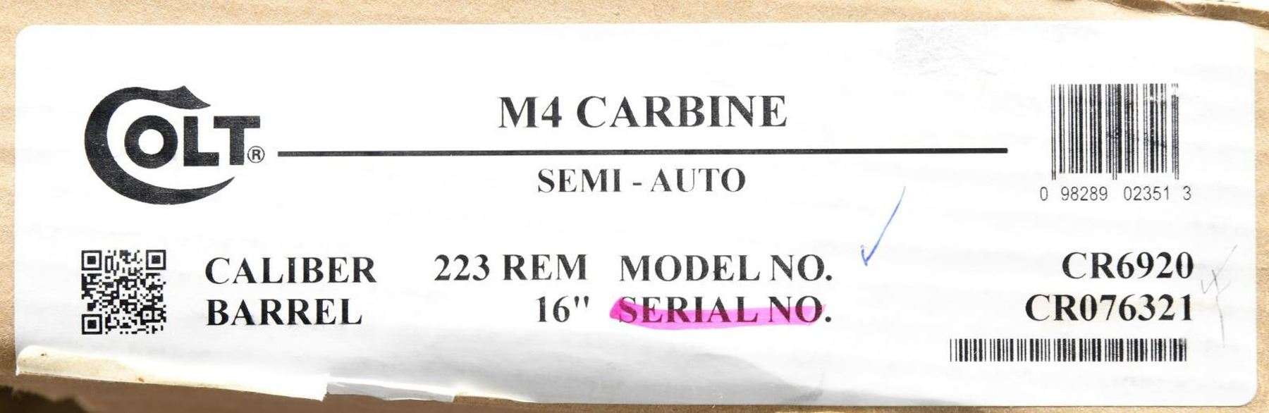 Cal. 5.56mm. S# CR076321. Bbl. 16". Colt's latest version of the time honored M4 Carbine. 16" M4 profile barrel w/ threaded muzzle, currently sporting A2 flash hider. Protected post front sight / gas block / bayonet lug & sling swivel. 6" A2 Carbine handguards retained w/ tapered delta ring. Flat top upper receiver w/ round forward assist & brass deflector. Currently sporting MBUS folding rear peep sight. 4 Position collapsible plastic stock. Left side marked "CARBINE / CAL. 5.56 MM" & serial number on mag well, and "COLT DEFENSE / HARTFORD, CONN / USA" above trigger. MAGS: 1 PMAG Gen M2 30 rd. UNATTACHED ACCESSORIES: factory box, lock & paperwork. CONDITION: as new in factory box. Never sold retail. No noticeable blemishing of any kind. Accessory package unopened. Bright bore w/ strong rifling. PROVENANCE: The Collection of Gun Sport Ltd. owned by Jon R. Thomas. (23-4665/JZ). MODERN. $1,000-1,500.