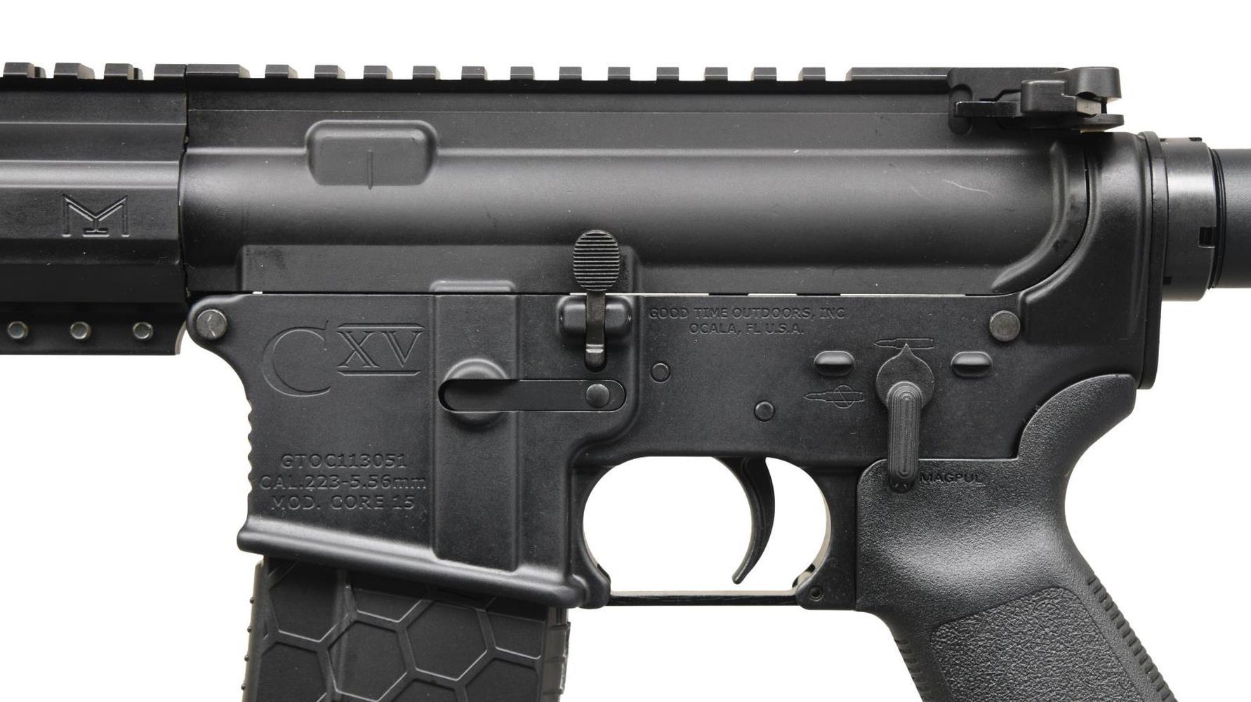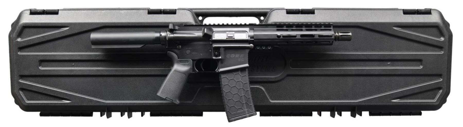 Cal. 5.56mm. S# GTOC113051. Bbl. 7.5". A 7" Free Float M-LOK Handguard with picatinny top rail, providing 12" of sight and optic mounting real estate. Matte black finish. Threaded barrel terminated with A2 flash hider. Nitride Bolt Carrier Group. Pistol-length gas system. Aluminum-forged 7075-T6 Mil-Spec upper and lower receivers. Round forward assist and brass deflector. Left side controls. Magpul MOE pistol grip. Six-position Mil-Spec buffer tube. MAGS: one black 30 rd. HexMag with orange follower. UNATTACHED ACCESSORIES: a black plastic, foam-lined transport case, lock, and paperwork. CONDITION: all aspects appear as new. No sign of wear in any capacity. Never sold retail. Bright bore with strong rifling. Fire control mechanism appears to function correctly when cycled by hand. PROVENANCE: from the collection of Gun Sport Ltd., owned by Jon R. Thomas. (23-3765/JZ). MODERN. $500-800.