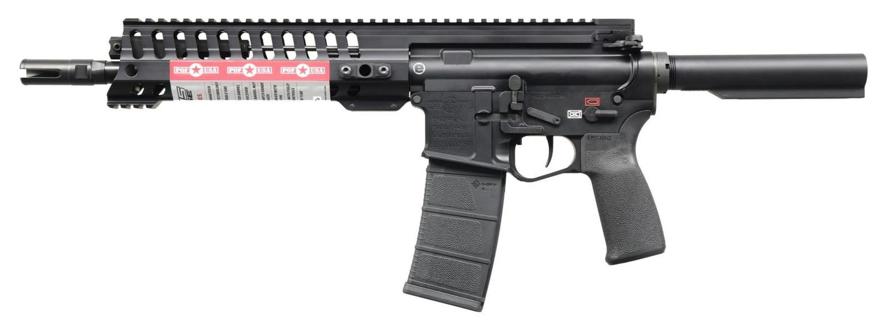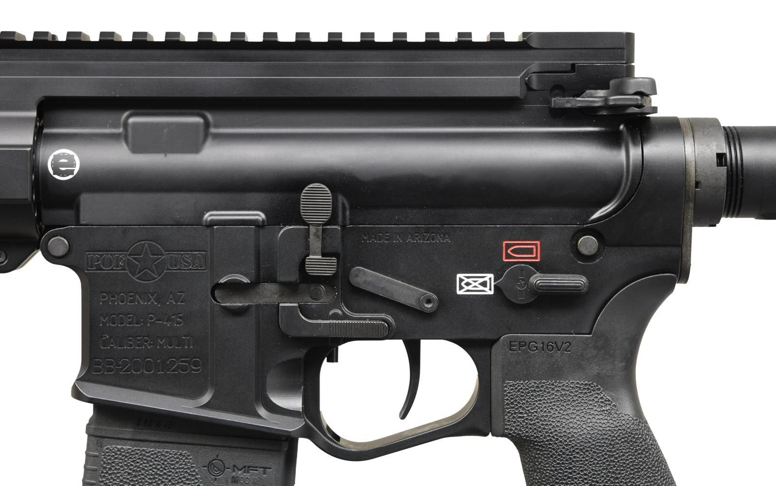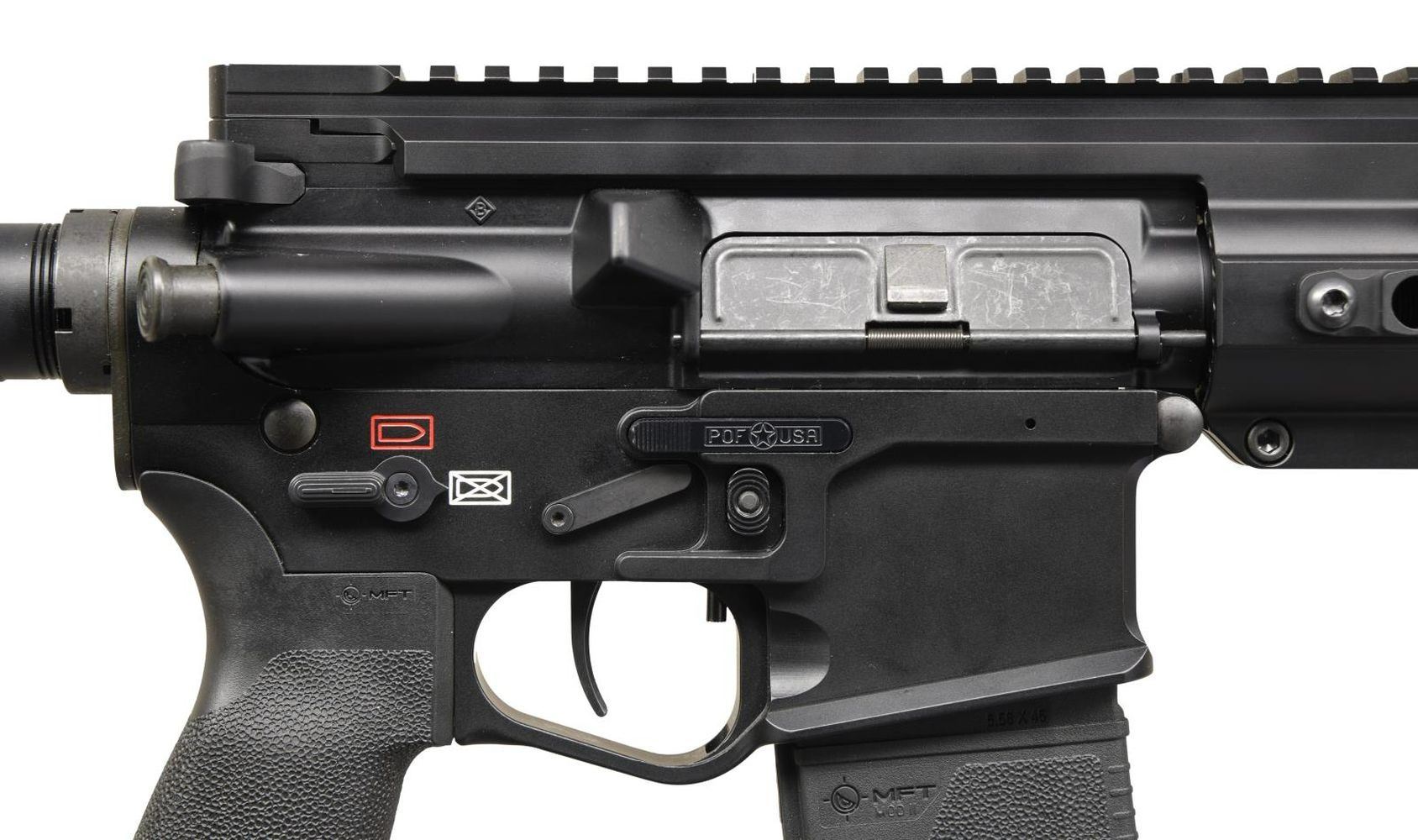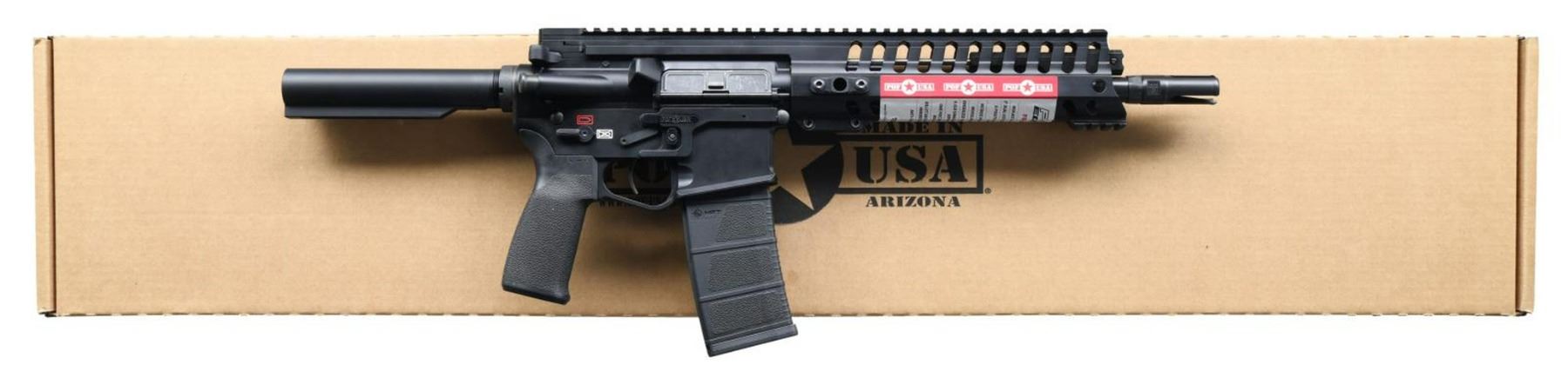 Cal. 5.56 NATO. S# BB-2001259. Bbl. 10.5". Nitride heat treated, 4150 chrome vanadium, threaded barrel terminated w/ 3 prong flash hider. 9" Modular Rail providing 15" of real estate for optic mounting. E-Square dual extraction chamber. Oversize heat-sink barrel nut. 5-Position adjustable gas piston. Round forward assist w/ brass deflector. Ambidextrous controls. 6 Position, anti-tilt buffer tube. MFT EPG16V2 pistol grip. Black anodized finish. MAGS: 1 black MFT 30 rd. UNATTACHED ACCESSORIES: factory box, lock & paperwork. CONDITION: all aspects indicate as new in box. No sign of use of any kind. Bright bore w/ strong rifling. Fire control mechanism appears to function correctly when cycled by hand. PROVENANCE: The Collection of Gun Sport Ltd owned by Jon R. Thomas. (23-4050/JZ). MODERN. $1,200-1,800.