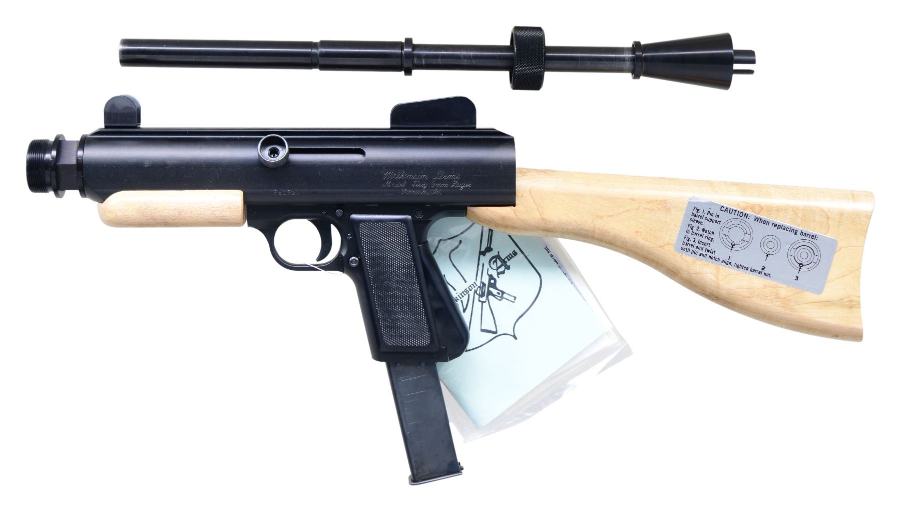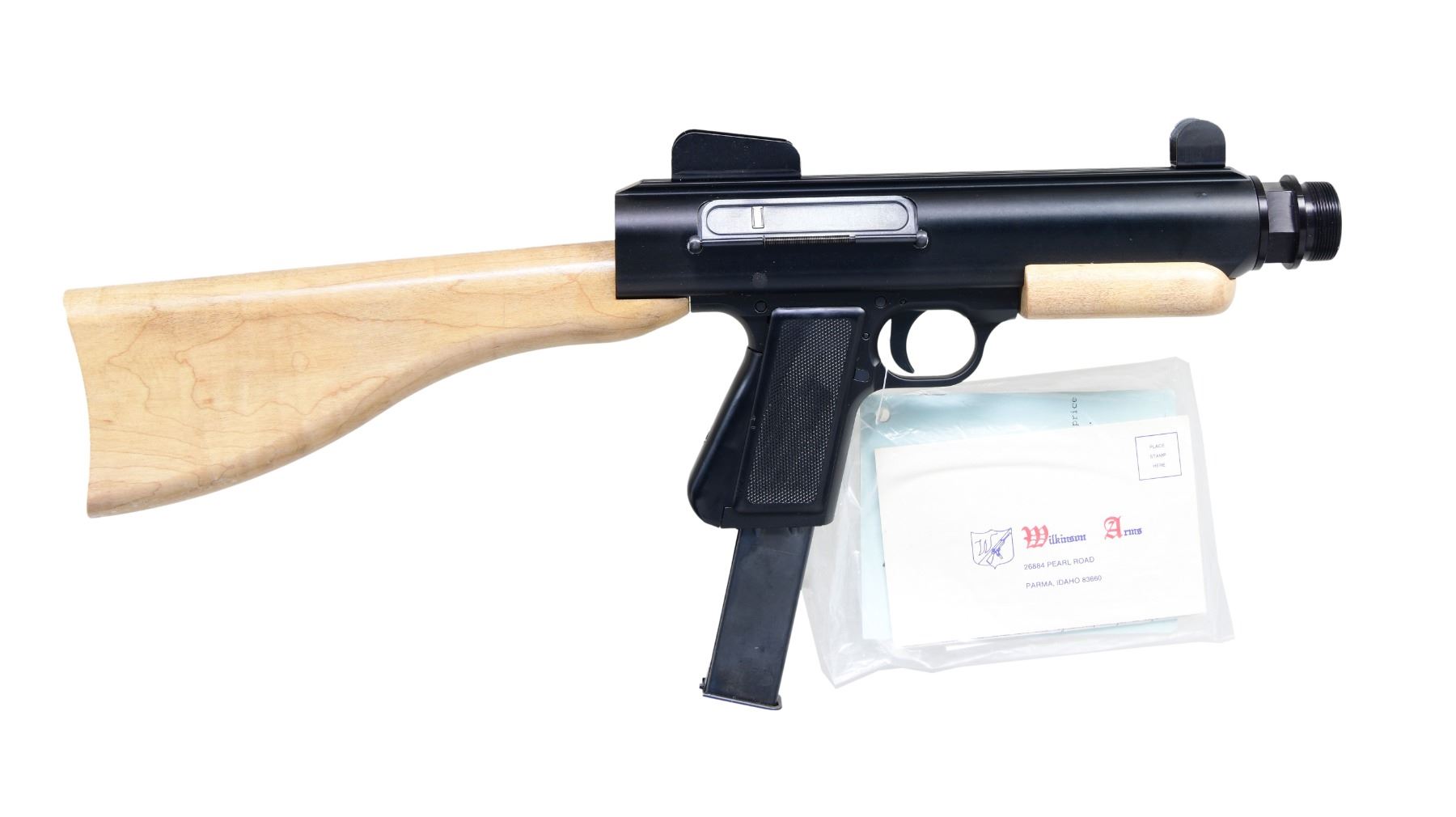 Cal. 9mm Luger. S# 881321. Bbl. 16". The Wilkinson Arms Terry was originally designed in 1960 by Ray Wilkinson of J&R Engineering. Originally having a more typical numerical model designation, after J&R closed up & Ray started the business again, as Wilkinson Arms they were named after his wife & daughters. This particular model, the Terry Carbine is a closed bolt, blowback operated design built on a semi-tubular receiver. It is fed through the pistol grip w/ a double stack, single feed magazine w/ a comfortable, tilted angle, unlike the Uzi, which presents at 90 degrees to the bolt. The muzzle is terminated w/ a 3-prong flash hider & a cone, similar to that used w/ the earlier M2 Carbine. Barrel is retained w/ a simple nut, making takedown for transport fast & easy. Protected blade front sight. Fixed, protected peep rear sight. Short blond hardwood forend matches the attractive blond hardwood shoulder stock. Black plastic checkered grip panels. The Terry is charged w/ a left side mounted, reciprocating charging handle. Ejection port on right side has a spring loaded, folding dust cover that opens automatically upon firing. Left side of receiver marked; "WILKINSON ARMS / MODEL TERRY 9MM LUGER / PARMA, ID" as well as serial number. MAGS: 1 factory 31 rd. UNATTACHED ACCESSORIES: Factory box & paperwork. CONDITION: All aspects indicate this gun remains as new in box w/ no sign of prior use. Finish & furniture unblemished. Stock still retains factory assembly sticker & paperwork sleeve still attached to trigger guard. Gun was unassembled in the box upon arrival to catalog. Magazine remains in original factory wrap. Bright bore w/ strong rifling. Fire control mechanism appears to function correctly when cycled by hand. PROVENANCE: Lifelong Collection of Terrence McCarty. (24-302/JZ). MODERN. $600-900.