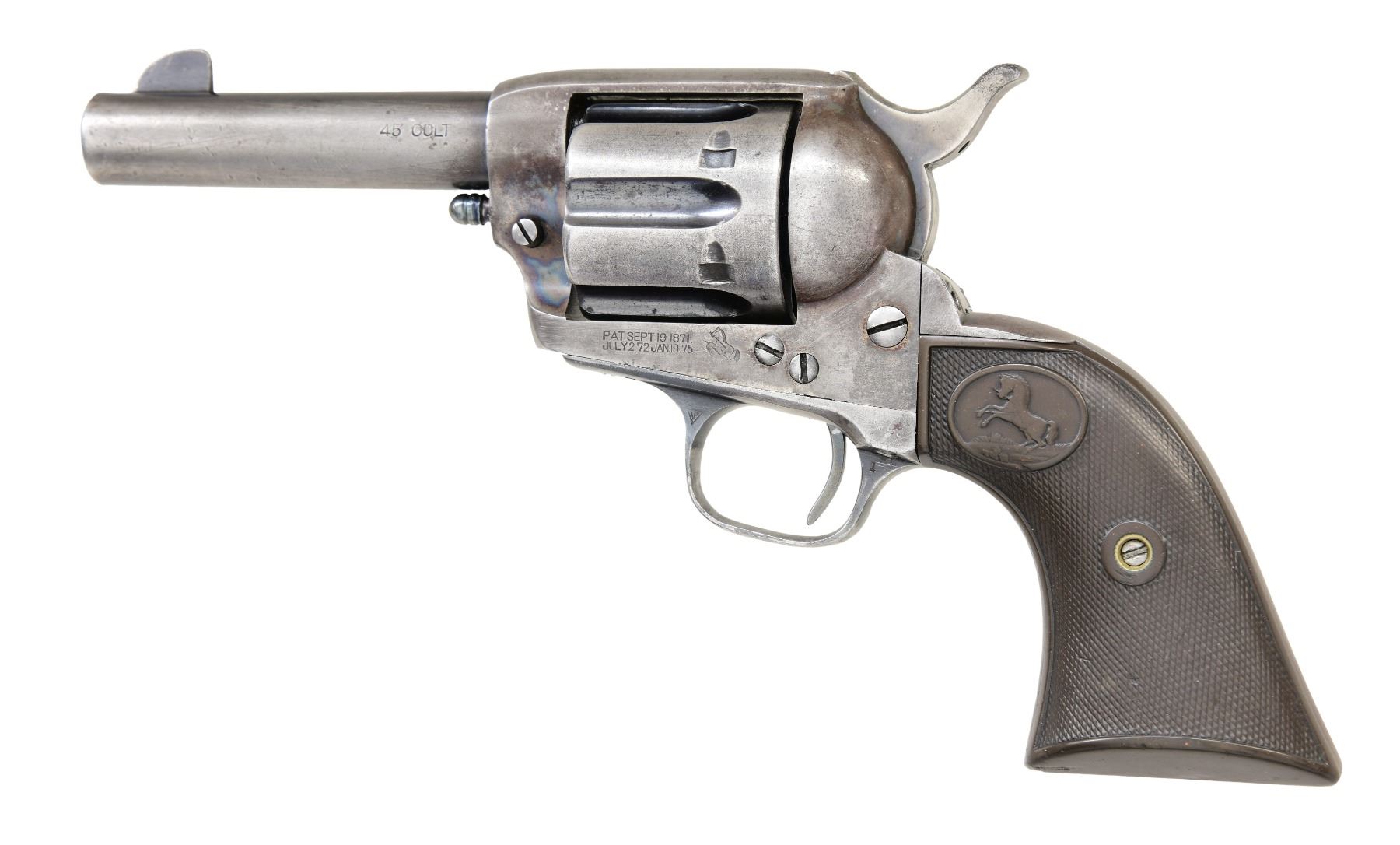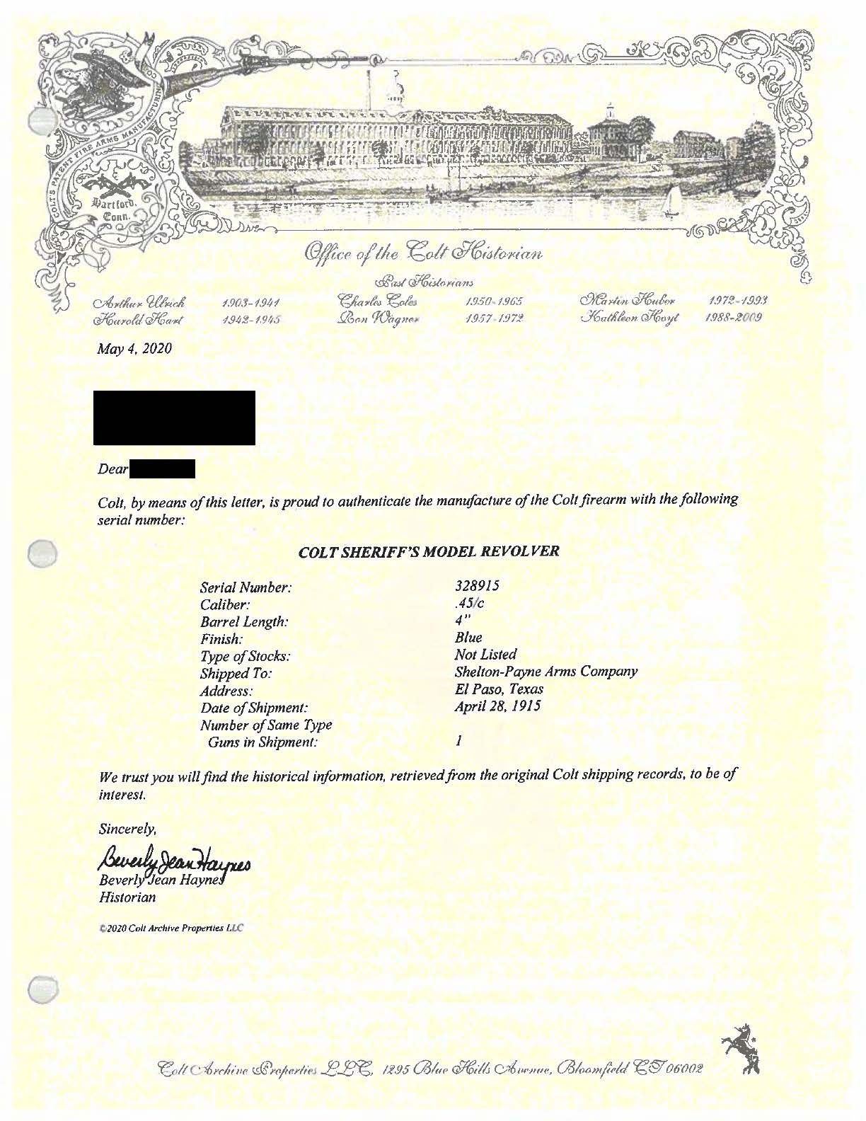 ARMY" VERY RARE COLT LONG FLUTE SHERIFF'S MODEL SAA REVOLVER. Cal. 45 Colt. S# 328915. Bbl. 4" w/o ejector. Six shot long flute cyl. Long flute cyls. remaining after the model 1878 double action was discontinued were altered for use in single action revolvers. The normal S# range for long flute use is 330,001 to 331,479. "A Study of the Colt Single Action Army Revolver" by Graham, Kopec & Moore lists 8 out of range known long flute revolvers on page 157-158. Among these is this revolver, no. 328915 listed as a 4" Sheriff's model, assembly completed April 27, 1915 & shipped April 28th, 1915. This revolver is also pictured on page 77 under the chapter pertaining to Sheriff's Models. Blue & case colored finish. 2 piece checkered hard rubber rampant colt grips. Frame & grip straps have matching S#s. Sheriff's model revolvers with long flute cyls. are practically unheard of. UNATTACHED ACCESSORIES: letter from Colt Archive Properties LLC detailing the following information, "Serial Number: 328915 / Caliber: .45/c / Barrel Length: 4" / Finish: Blue / Type of Stocks: Not Listed / Shipped To: Shelton-Payne Arms Company / Address: El Paso, Texas / Date of Shipment: April 28, 1915 / Number of Same Type Guns in Shipment: 1". CONDITION: bbl., cyl. & grip straps retain worn blue in protected areas, carry areas have faded to gray. Frame shows 30% visible case colors primarily on the right side & forward portions of frame w/ balance fading to gray from carry use. Grips have worn checkering w/ small chips at toe. Cyl. stops short of indexing when action is cycled. Bore retains strong rifling. (24-2052/DS). CURIO. $17,500-25,000.