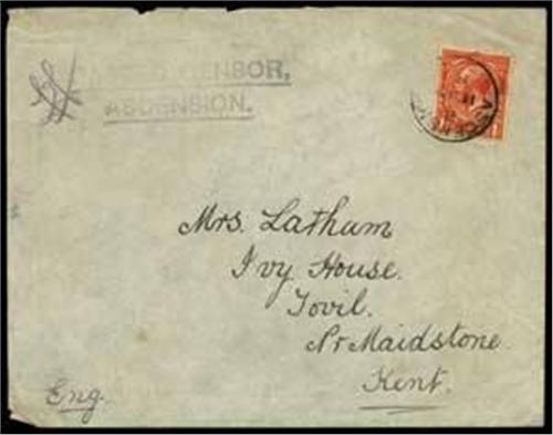 Postal History: KGV cover addressed to England, franked with 1d red tied by ASCENSION single circle 11 My datestamp (year illegible), with PASSED CENSOR/ASCENSION h/s and censors initials to left, signs of ageing