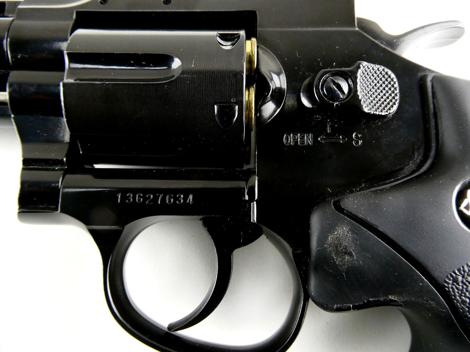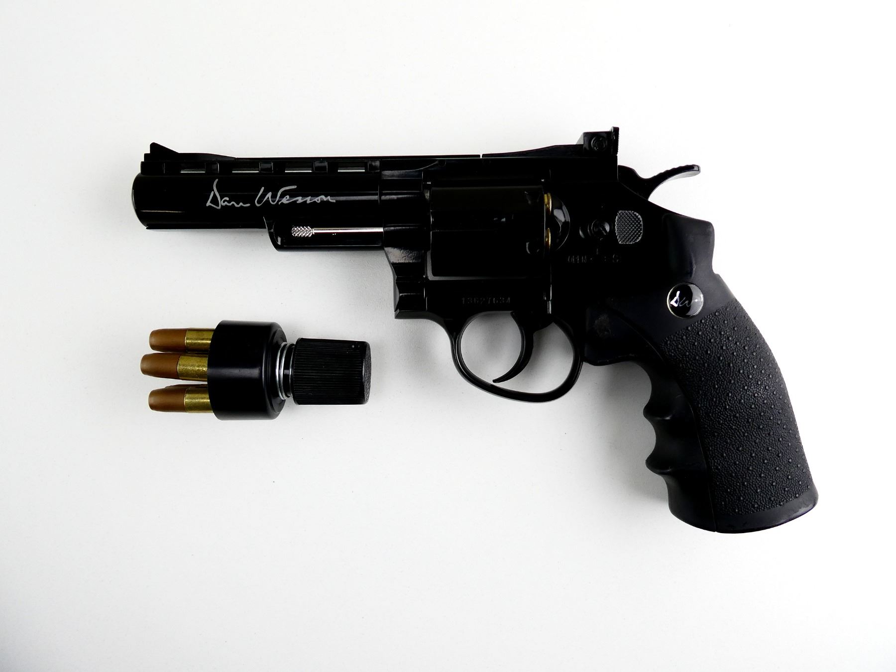 LOT INCLUDES; (1) .177 CAL PELLET, CO2, REVOLVER, MARKED: "DAN WESSON", "177", ETC., BLACK METAL CONSTRUCTION, FRONT SIGHT & ADJUSTABLE REAR SIGHT, NO COCKING ISSUES, NOT FULLY TESTED, (12) REUSEABLE PELLET HOLDERS, & (1) SPEED LOADER. SEE PHOTOS.