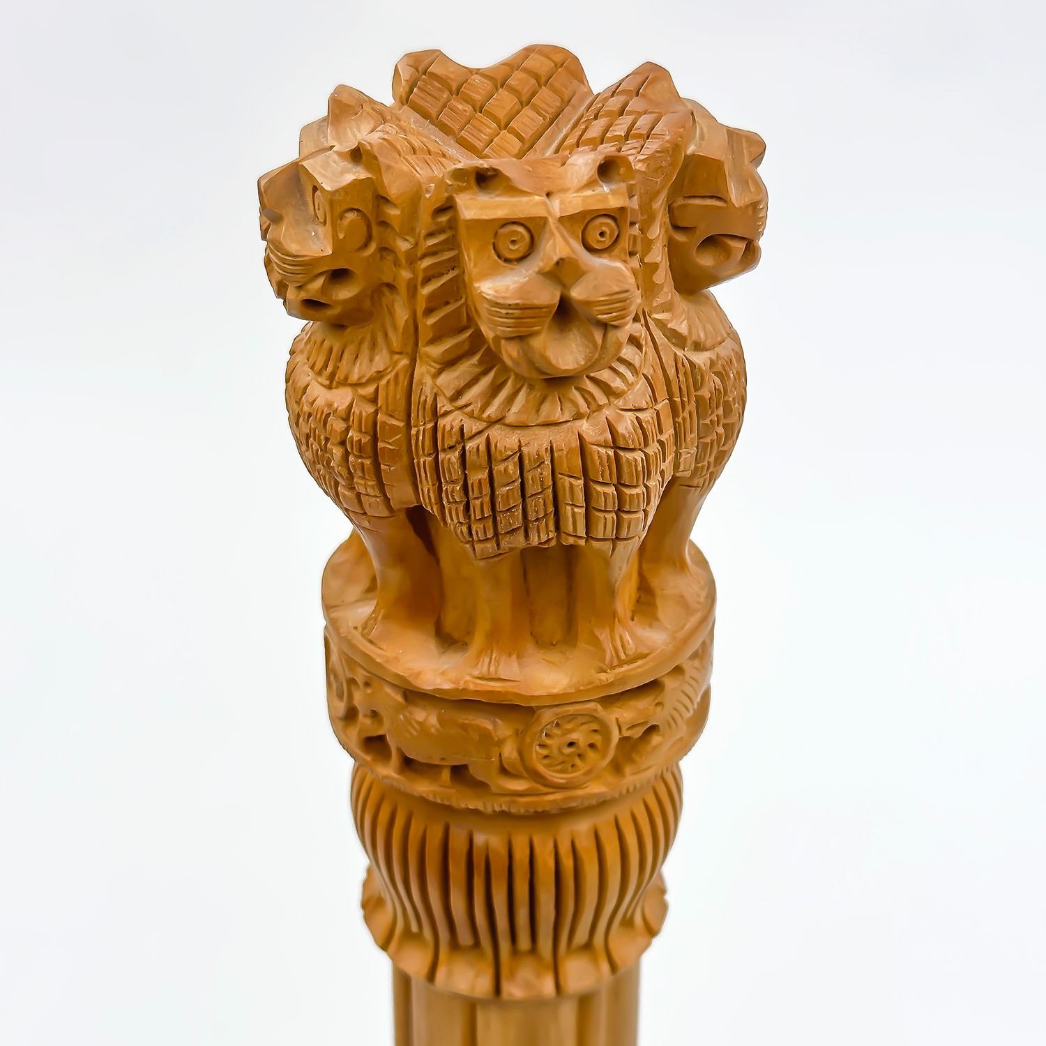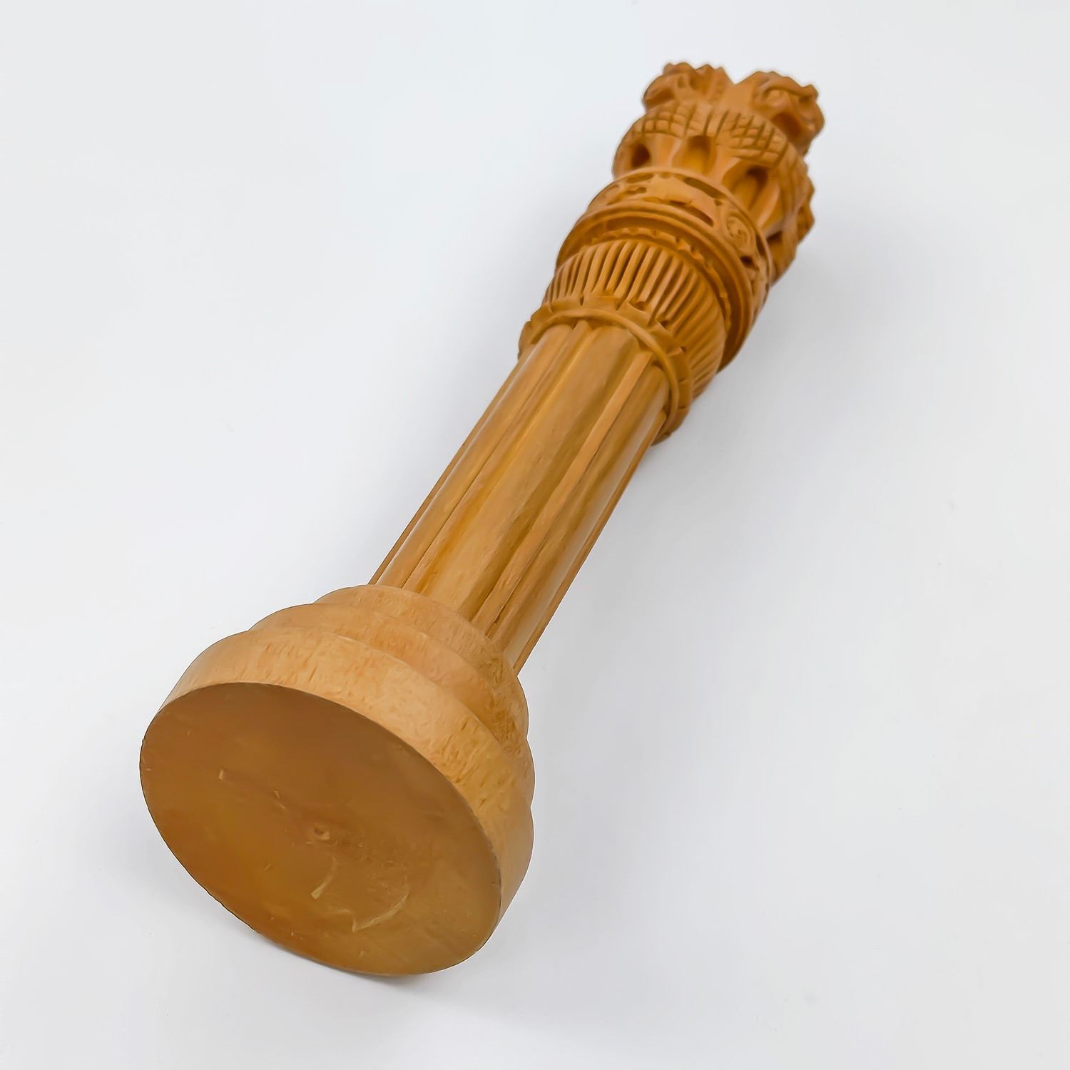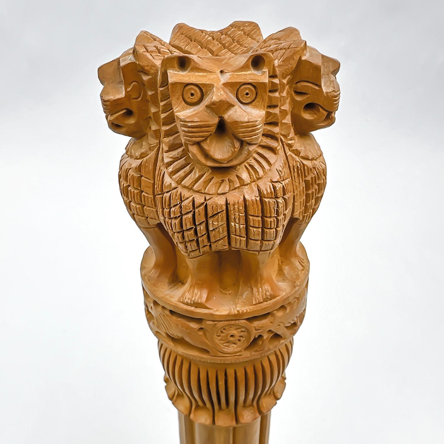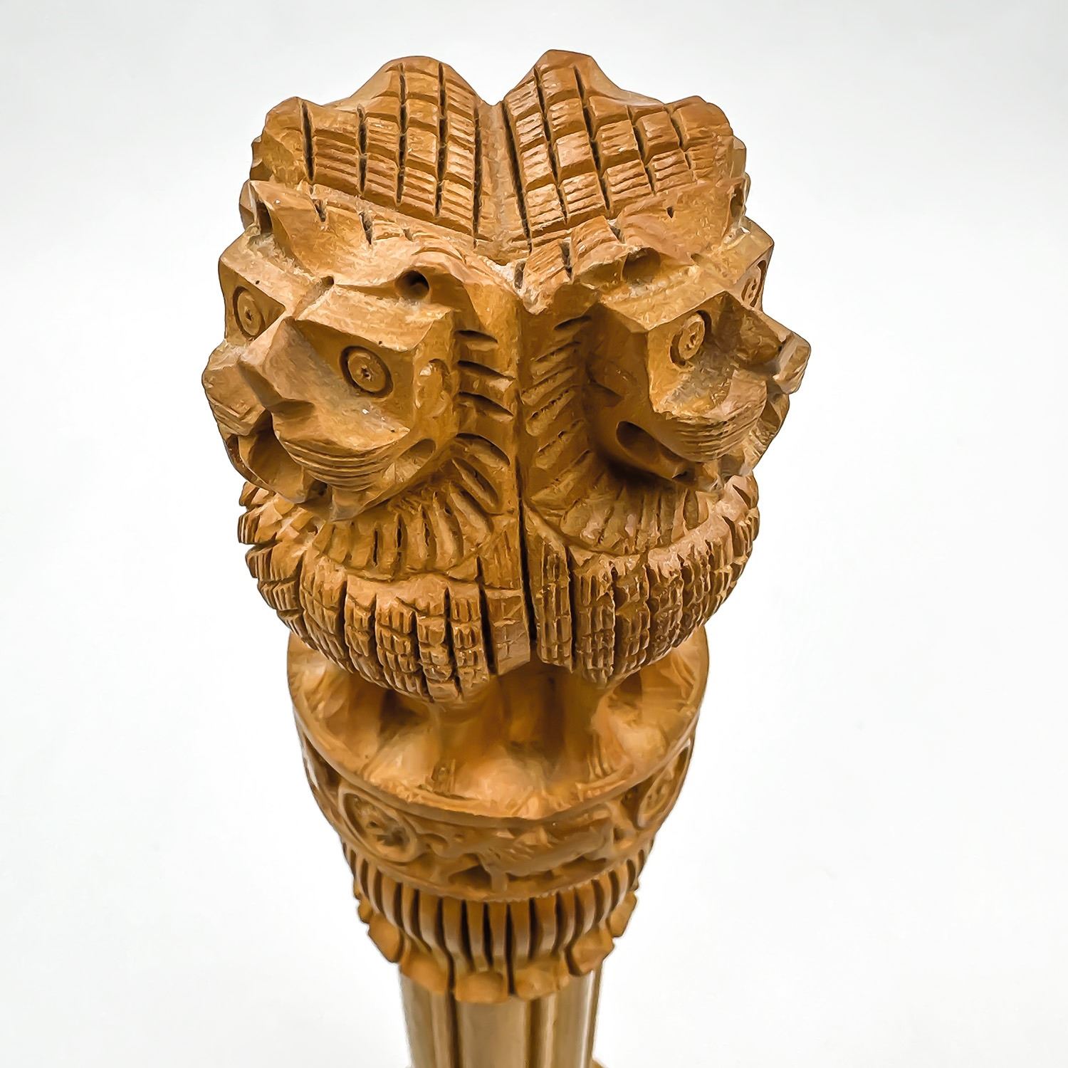 #8865 - HAND CRAFTED WOODEN SCULPTURE. THE INDIAN NATIONAL EMBLEM ADOPTED FROM THE LION CAPITAL OF ASHOKA AT SAMATH - FOUR LIONS BACK TO BACK. MEASURES: 10” (25.5 CM) TALL BY 2.75” (7 CM) DIAMETER BASE***ITEM(S) LOCATED IN LETHBRIDGE ALBERTA. FREE TRANSPORT TO EDMONTON OFFICE AVAILABLE FOR THIS AUCTION. WORLDWIDE SHIPPING IS AVAILABLE FOR ALL ITEMS