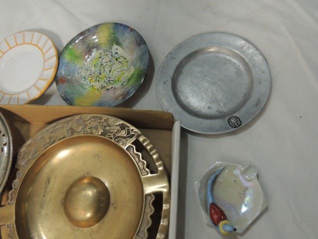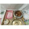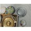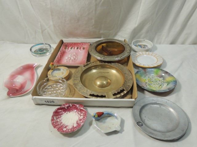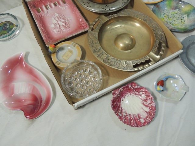 NICE ASHTRAY LOT WITH SILVER OVERLAY ON AMBER DEPRESSION GLASS, BRASS, PEWTER, POTTERY, VINTAGE JAPANESE BIRDS, ADVERTISING, CASINO, AND MORE, AS SHOWN. ALL FOR ONE MONEY.