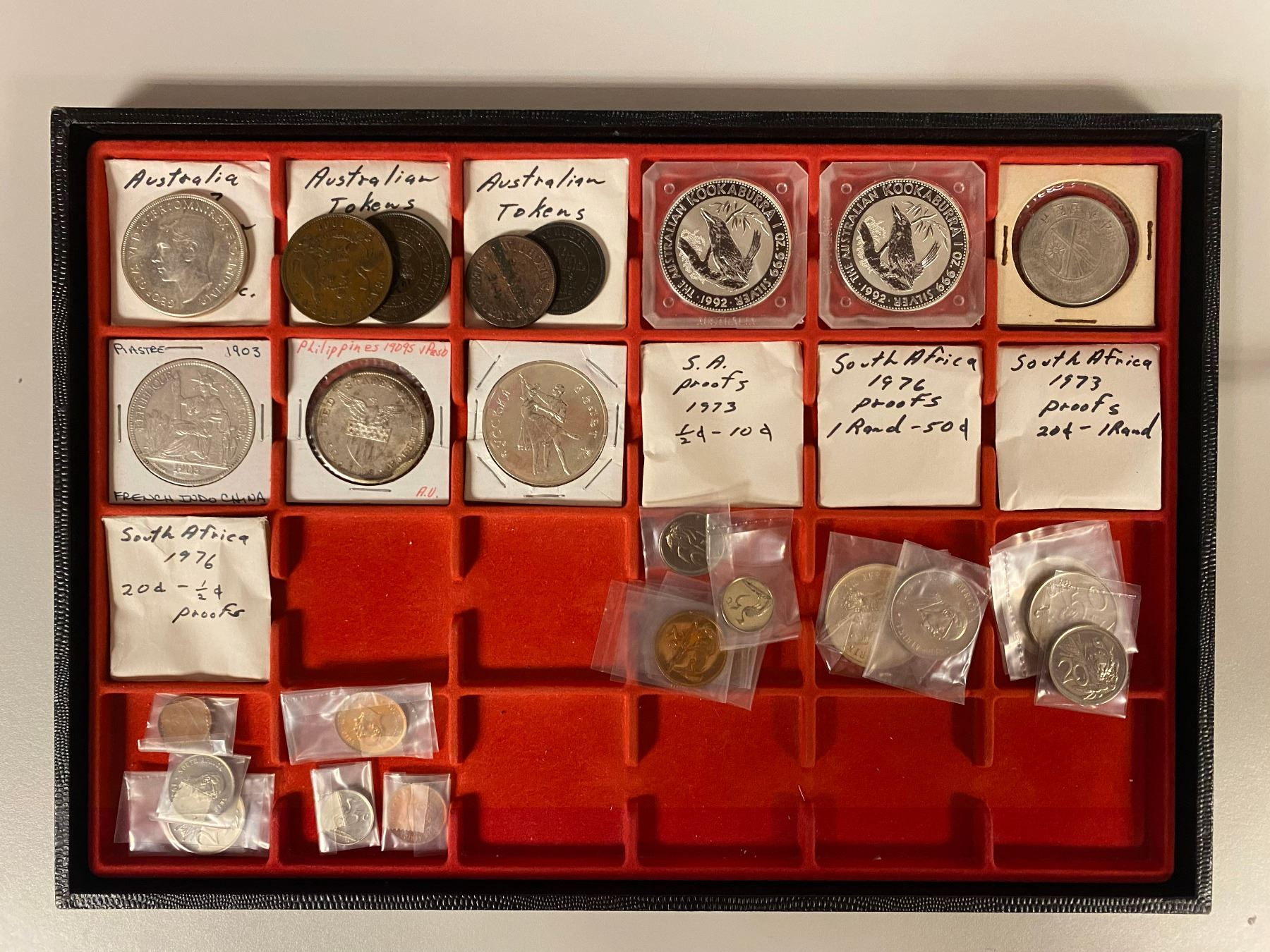 ASIA, AFRICA, AND AUSTRALIA: LOT of 27 coins, including Australia (7 pcs), China/Yunnan (1), French Indochina (1), Philippines (1), Russia/Federation (1), and South Africa (16); average circulated grades, as well as many uncs and proofs, many in silver, in consignor's 2x2 holders, viewing recommended; retail value $500, lot of 27 pieces.